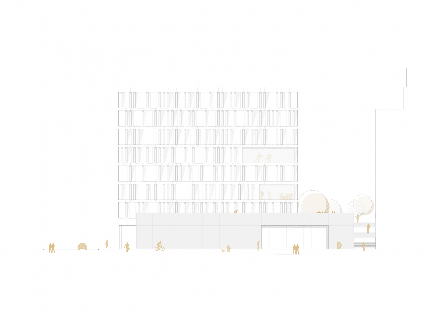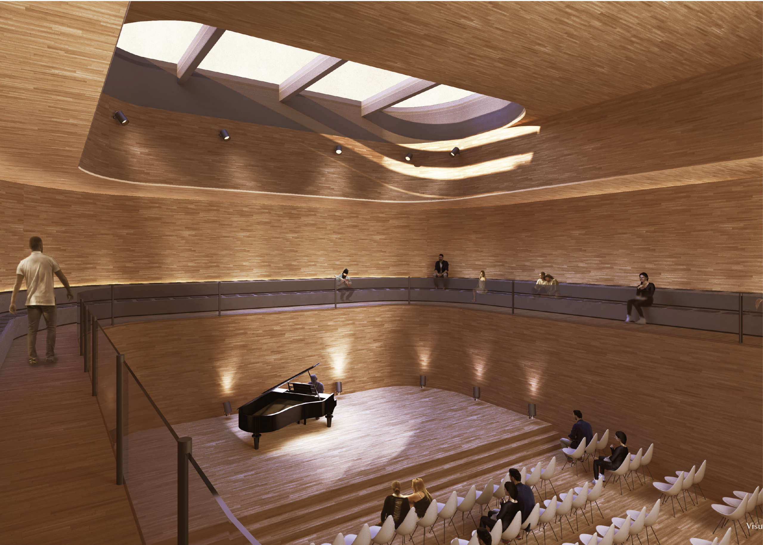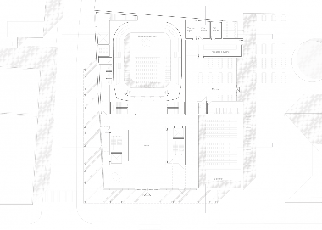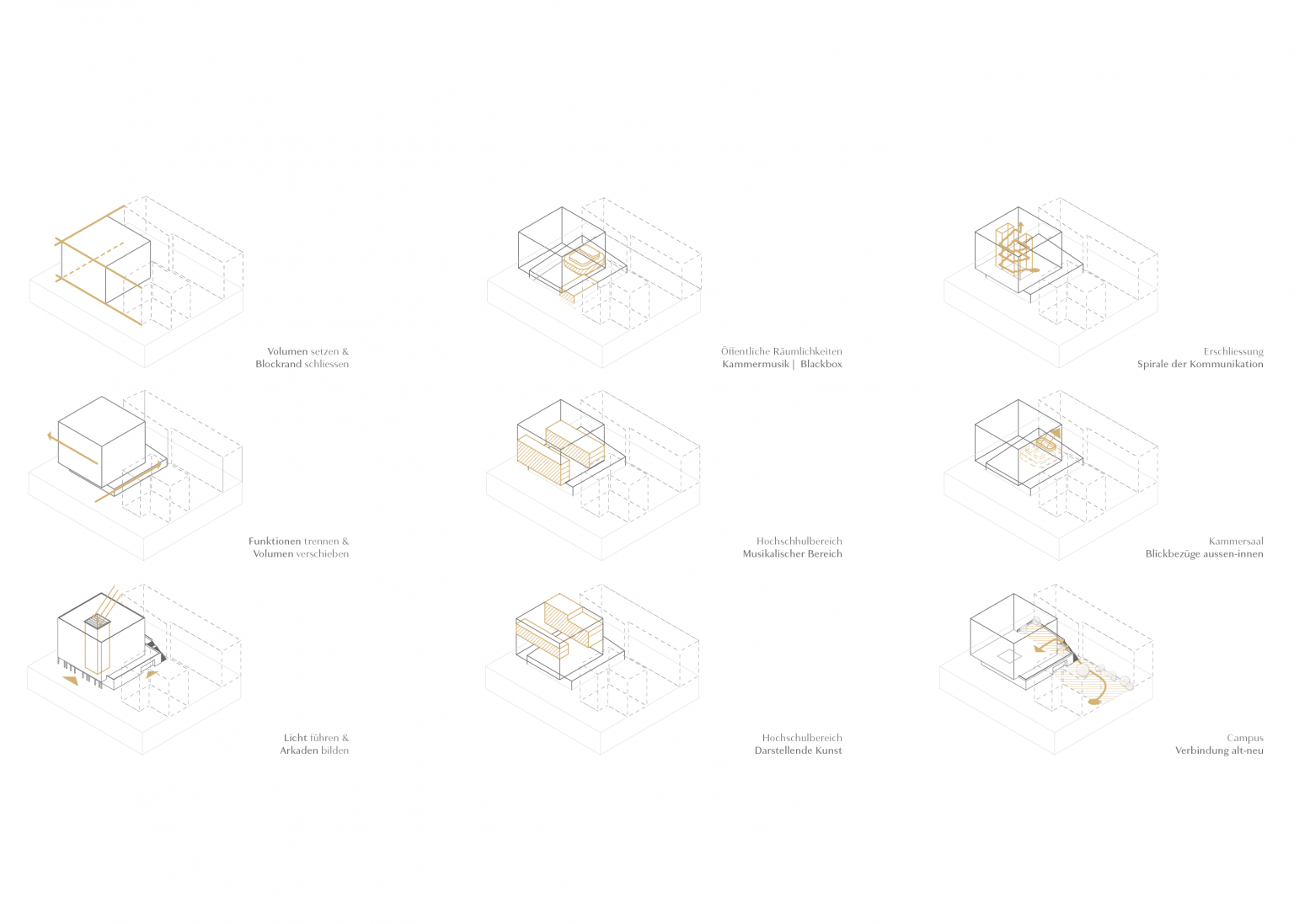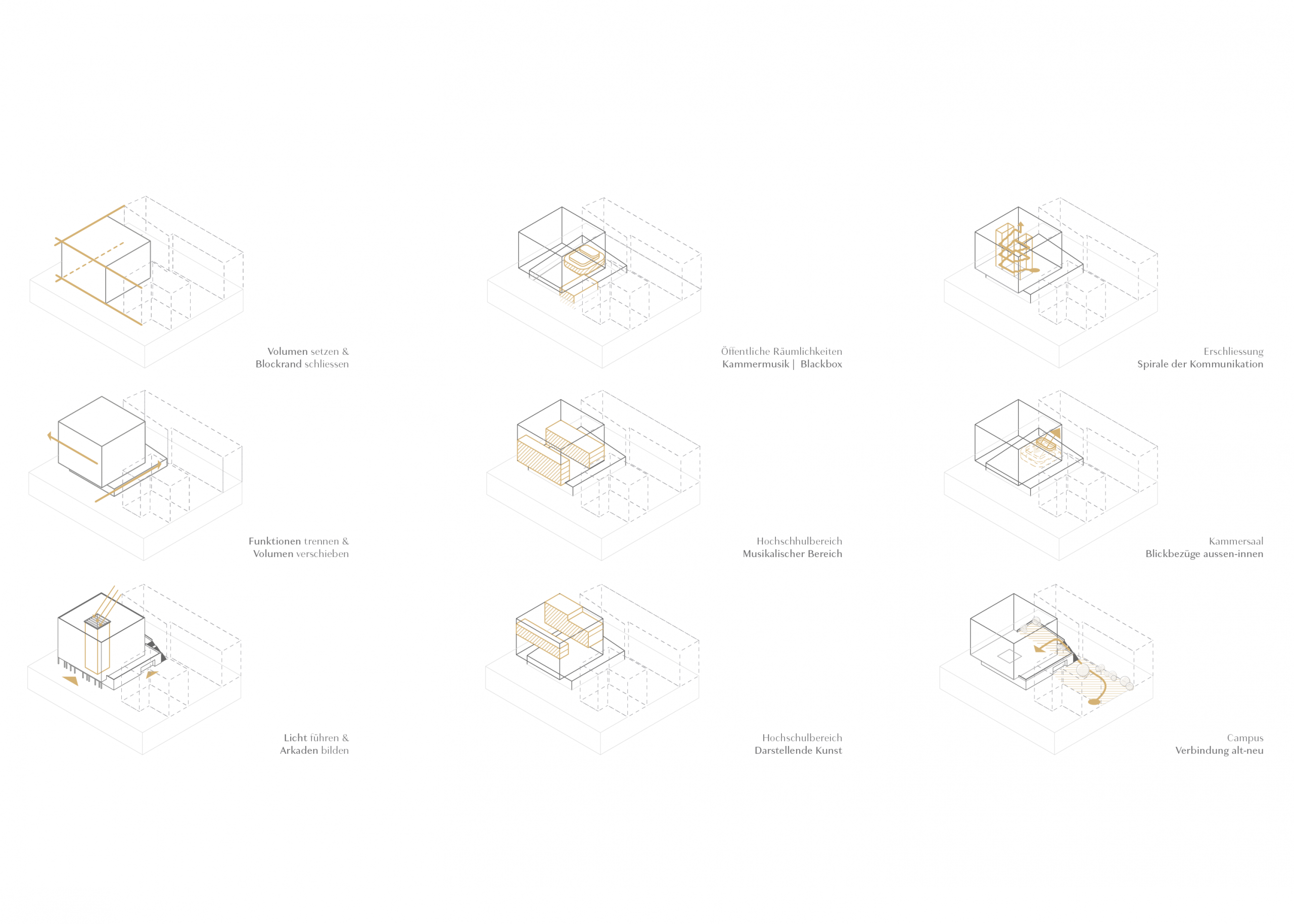 The State University of Music and Performing Arts Mannheim plans a new extension on the N7 square in the city center. The building houses public concert and dance spaces, rehearsal rooms, and teaching areas. A roof terrace connects the new campus to the university grounds, while circulation spirals around a central void leading to an open library.