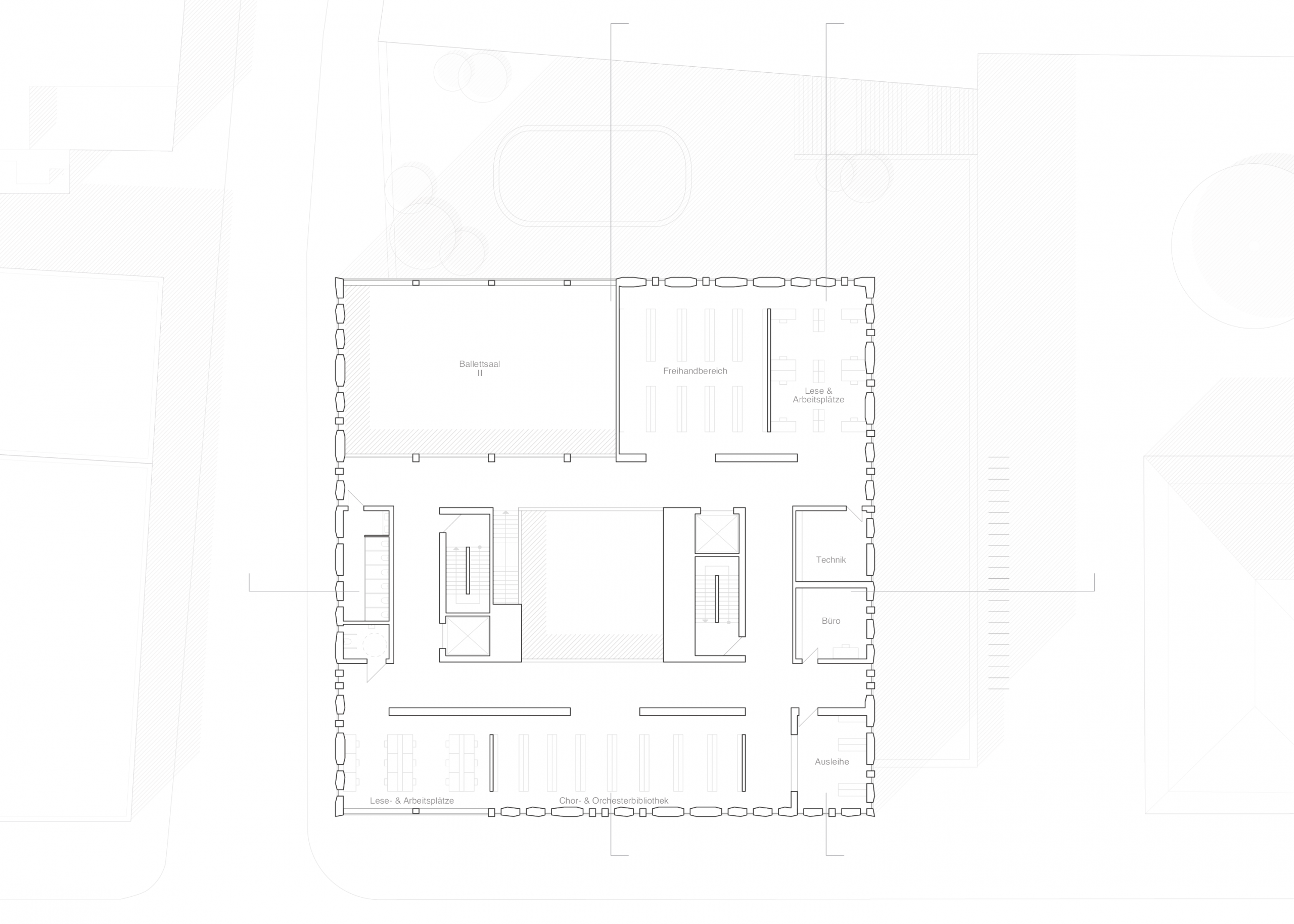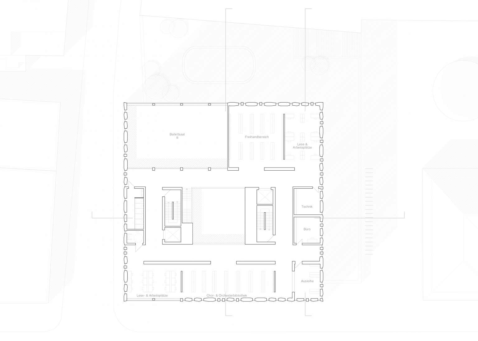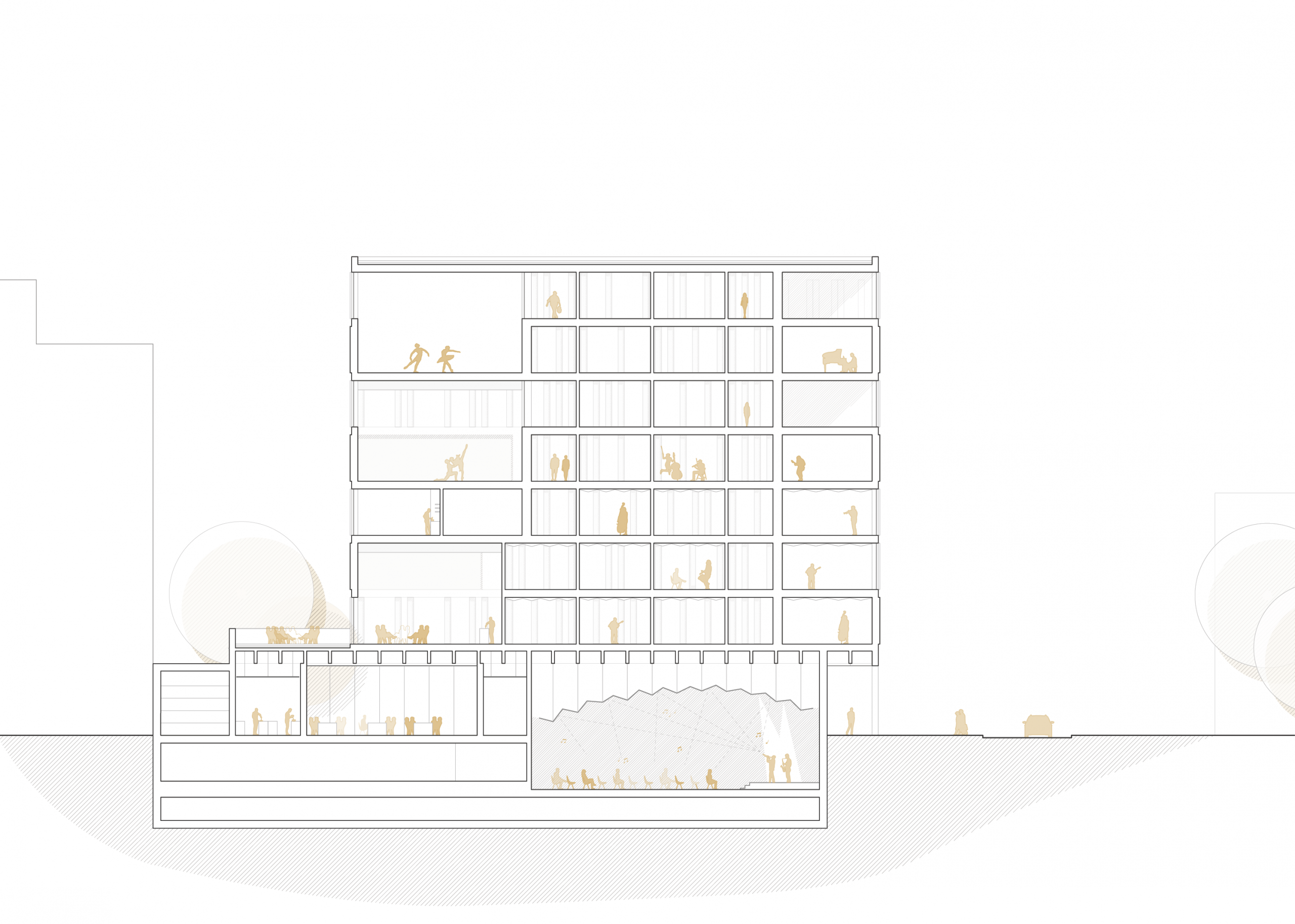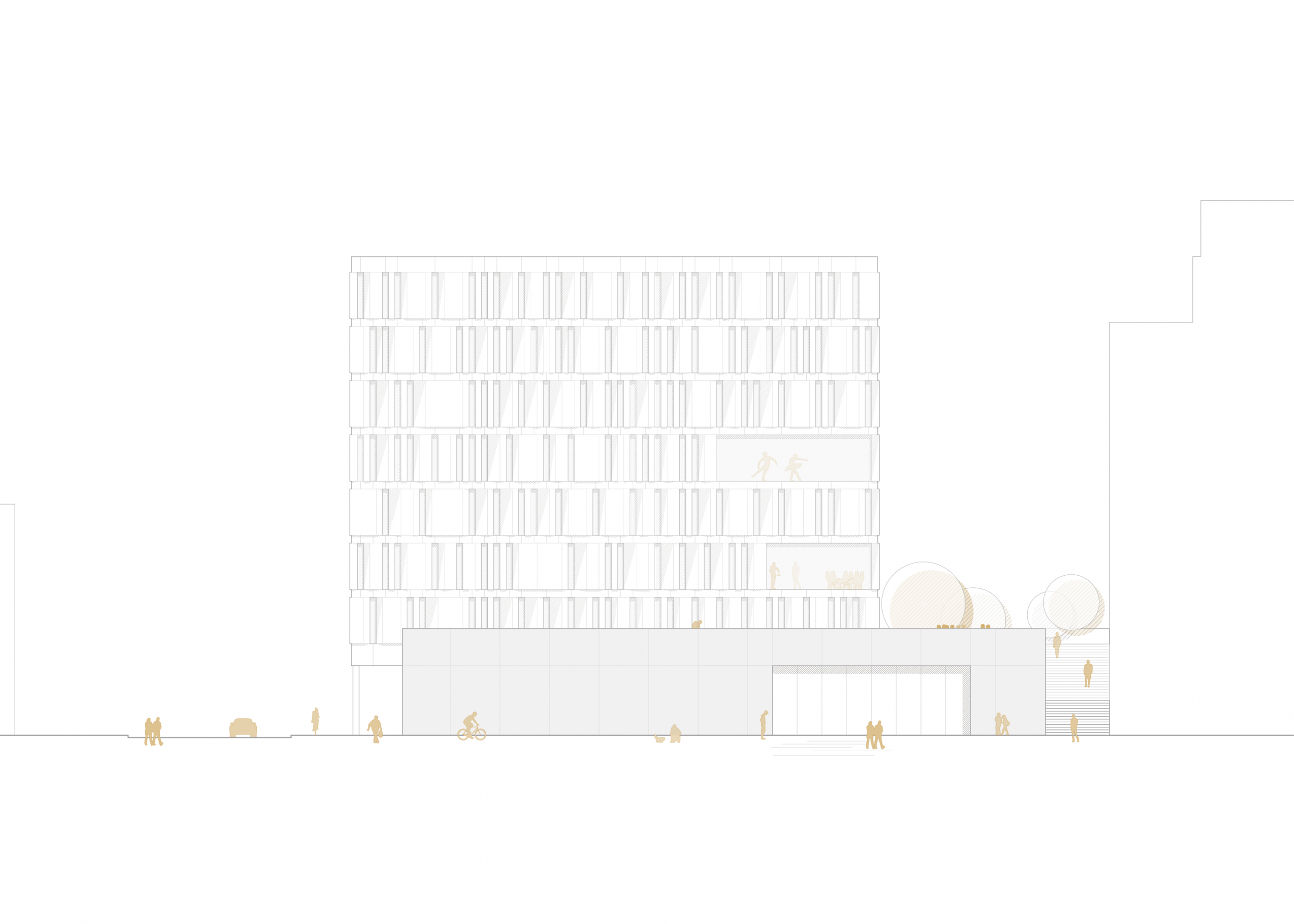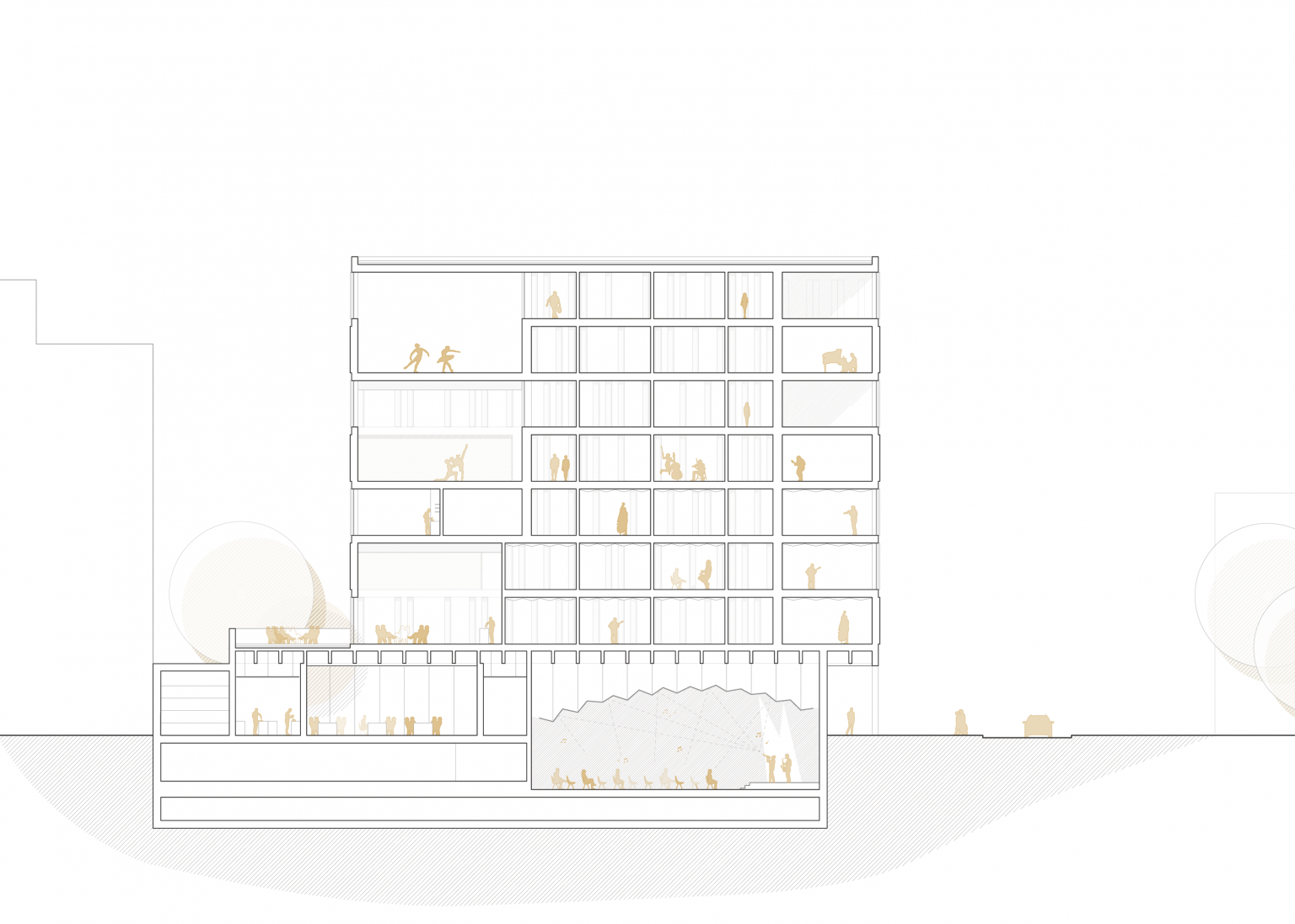 The State University of Music and Performing Arts Mannheim plans a new extension on the N7 square in the city center. The building houses public concert and dance spaces, rehearsal rooms, and teaching areas. A roof terrace connects the new campus to the university grounds, while circulation spirals around a central void leading to an open library.