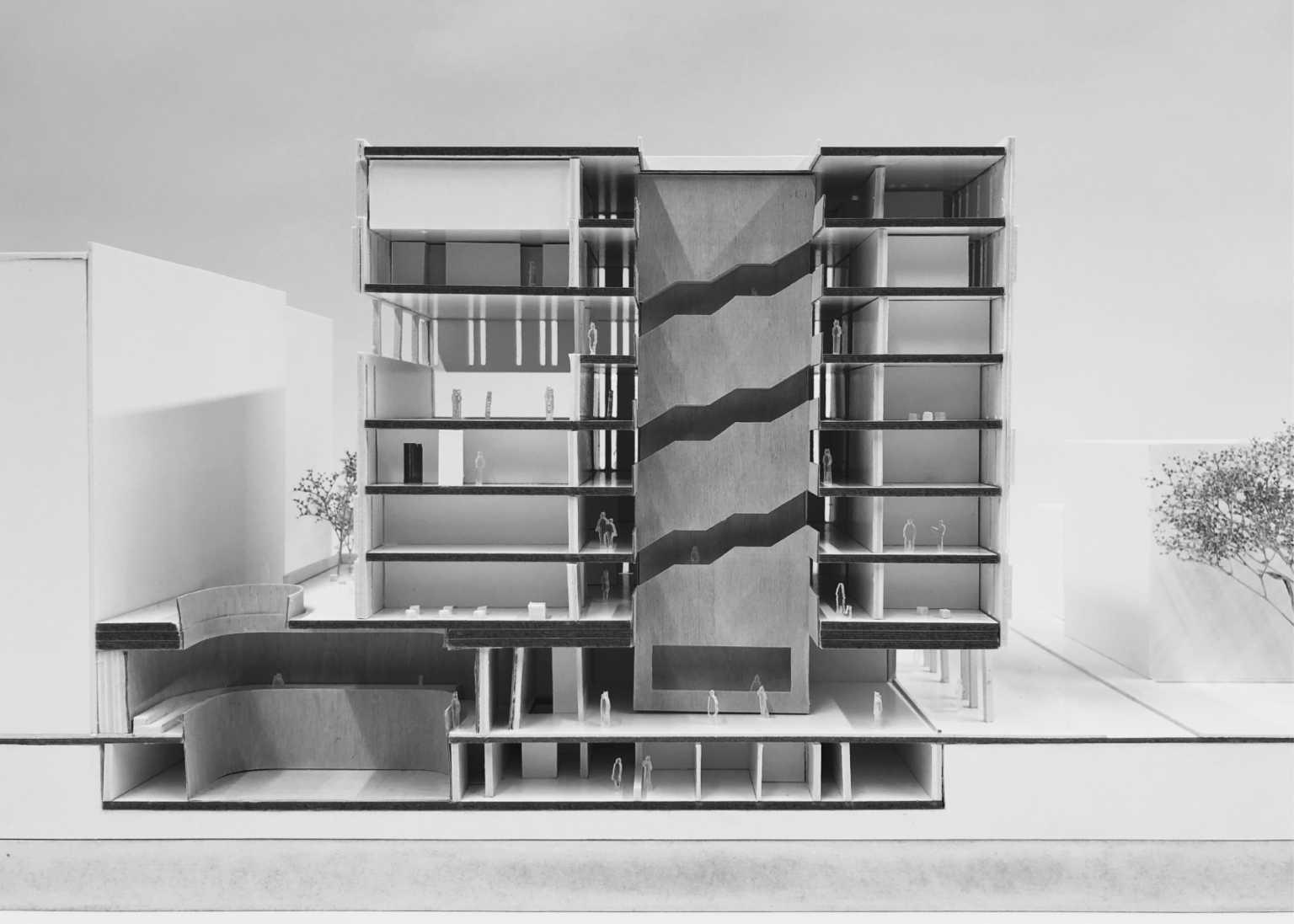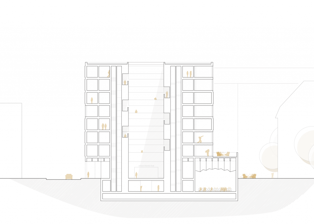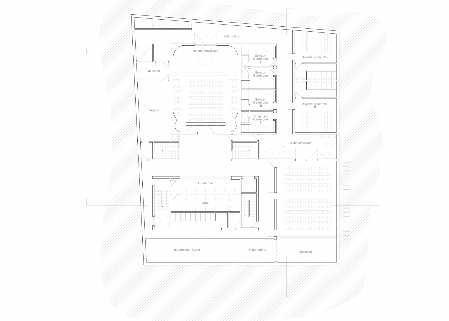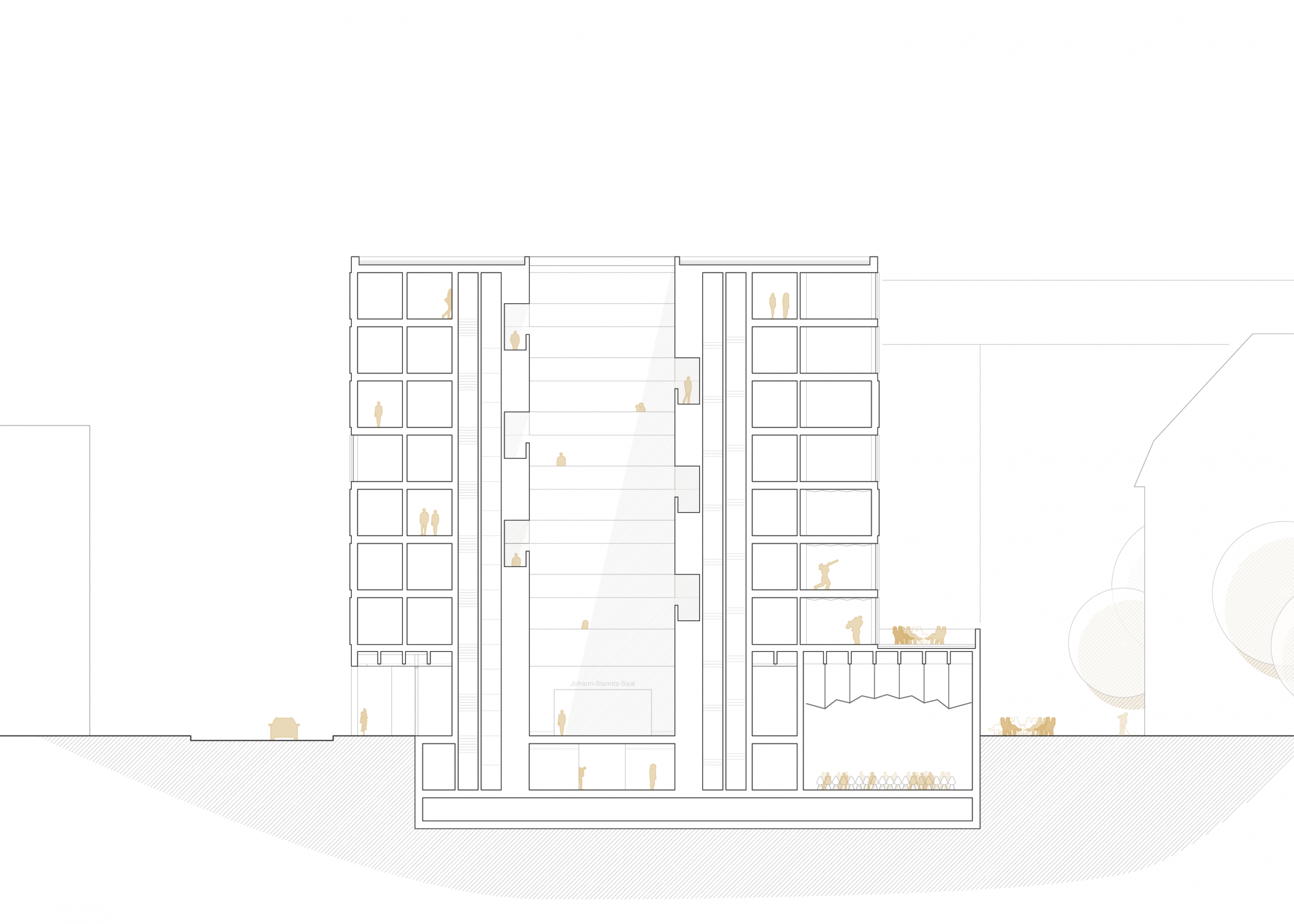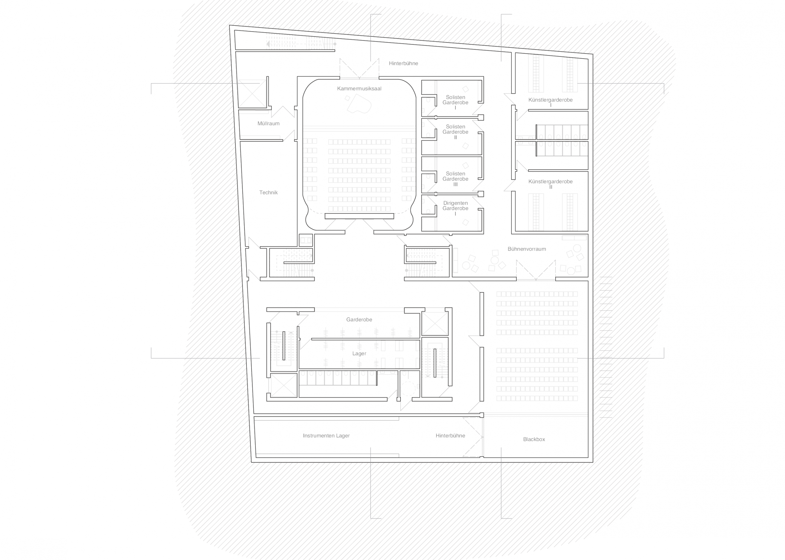 The State University of Music and Performing Arts Mannheim plans a new extension on the N7 square in the city center. The building houses public concert and dance spaces, rehearsal rooms, and teaching areas. A roof terrace connects the new campus to the university grounds, while circulation spirals around a central void leading to an open library.