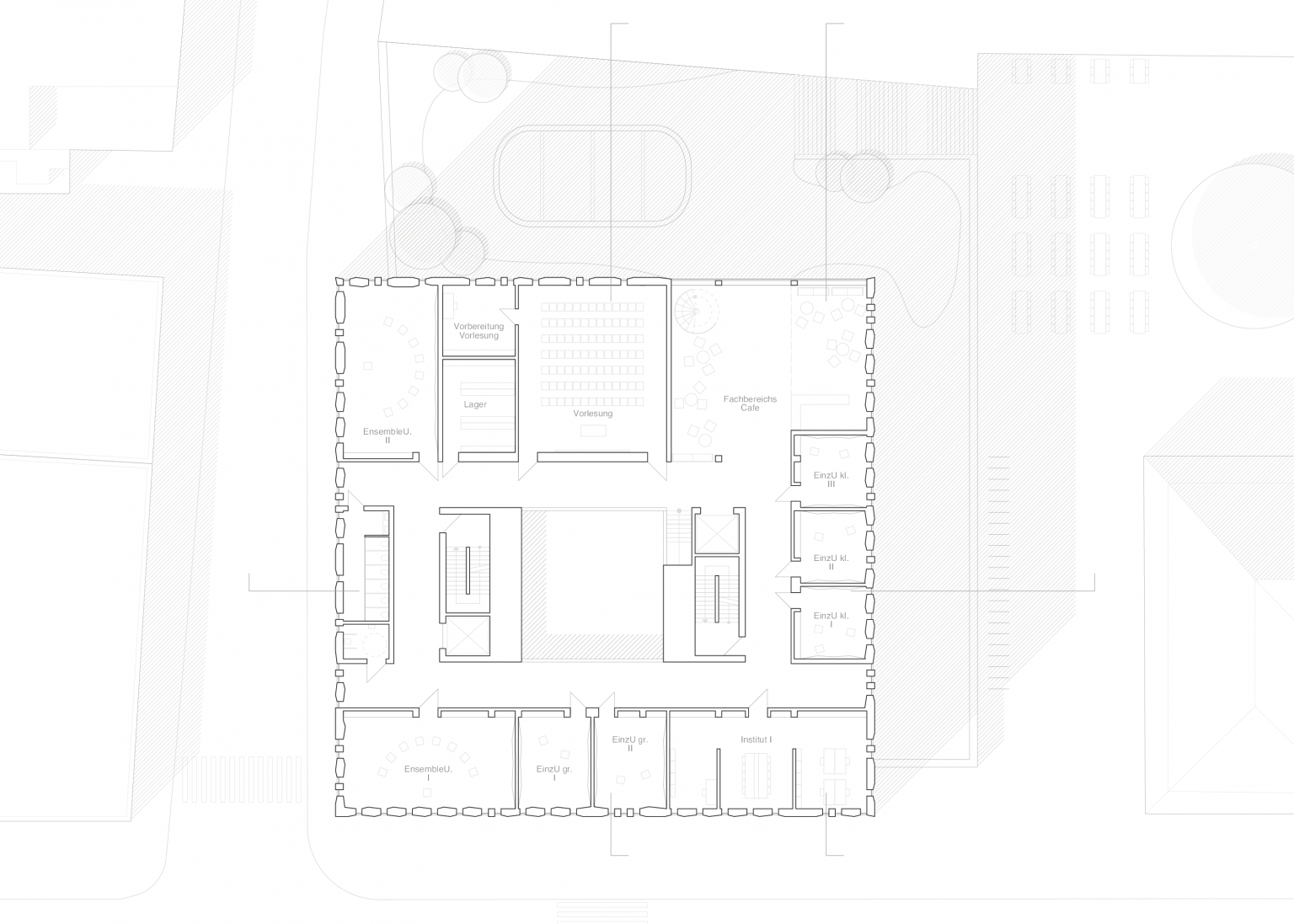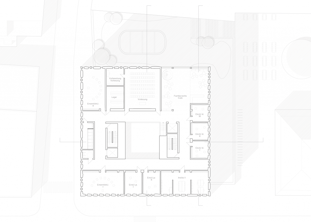To complete the N7 site, a corner facing the Lauer’sche Gärten is required, which determined the placement of the building volume. Public functions such as the chamber music hall and cafeteria are located on the ground floor, while music and ballet spaces occupy the first to seventh floors. A café on the second floor opens onto a roof terrace, which connects via a large staircase to the campus courtyard and links to the university grounds. The terrace also serves as a social meeting point. Circulation cores spiral around a central void and lead into an open library. Structurally, the upper floors are supported by arcades and a coffered ceiling system.