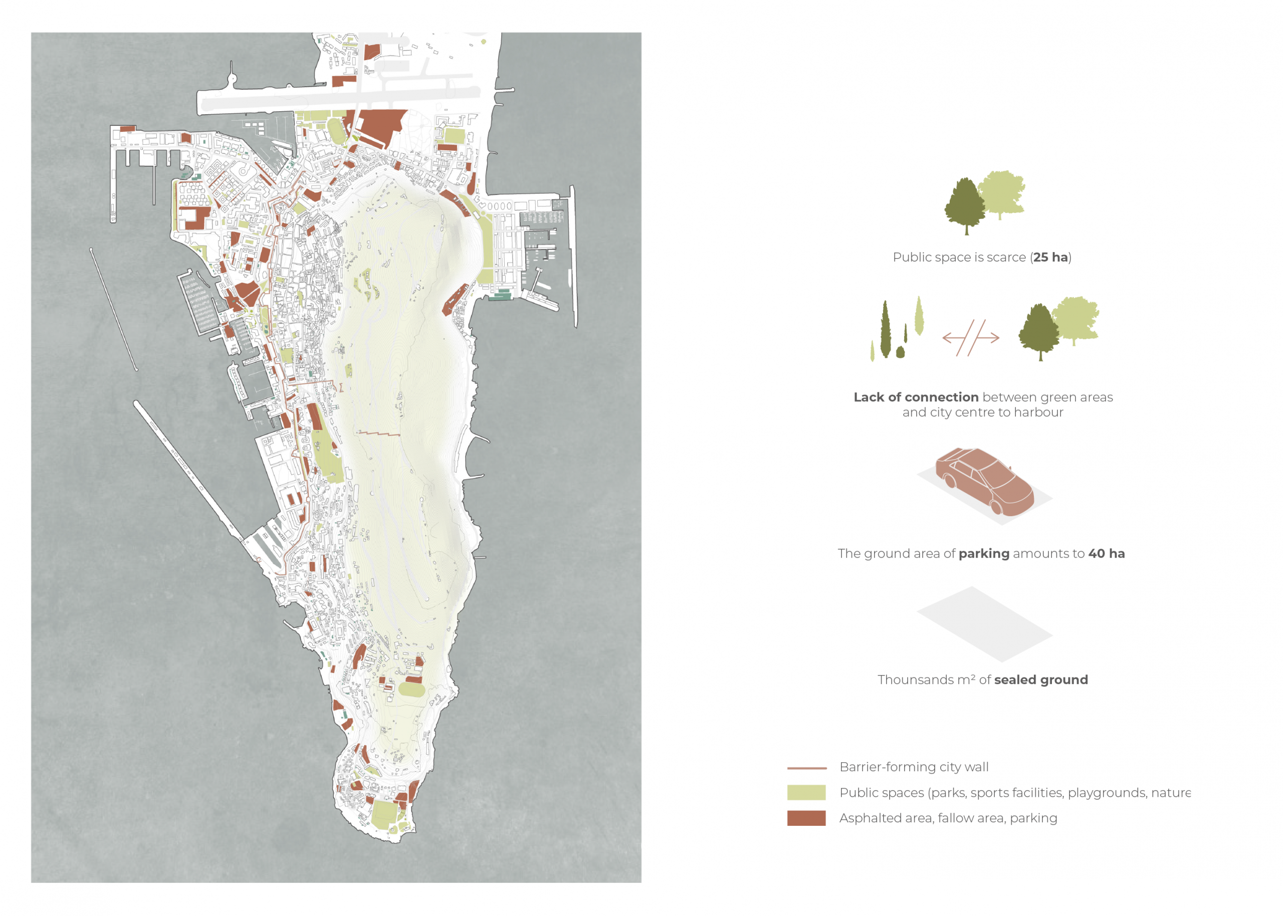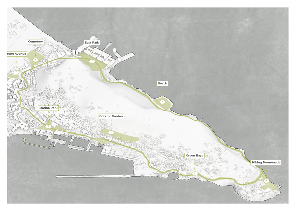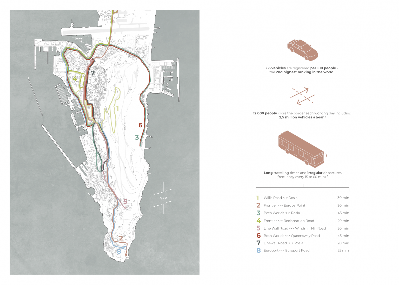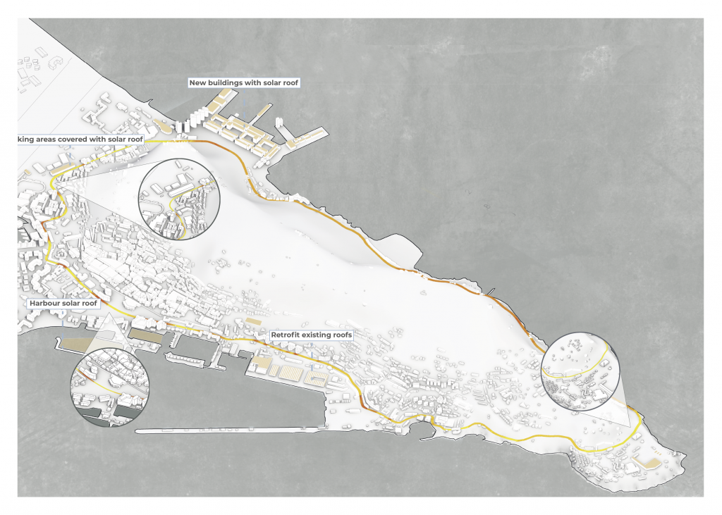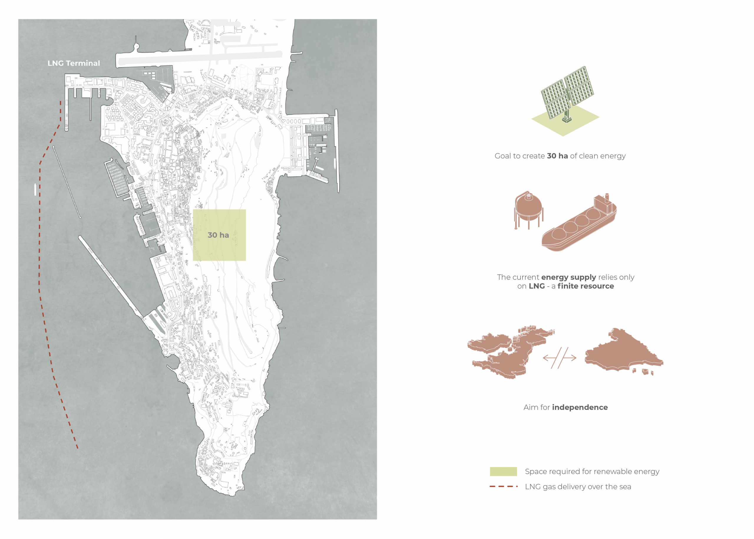 As part of an urban design project for Gibraltar, a future-oriented vision was developed to address three major challenges facing the peninsula: the lack of accessible green spaces, high levels of traffic congestion, and limited local energy production. These issues are closely interconnected and significantly influence the quality of life and sustainability of the urban environment.