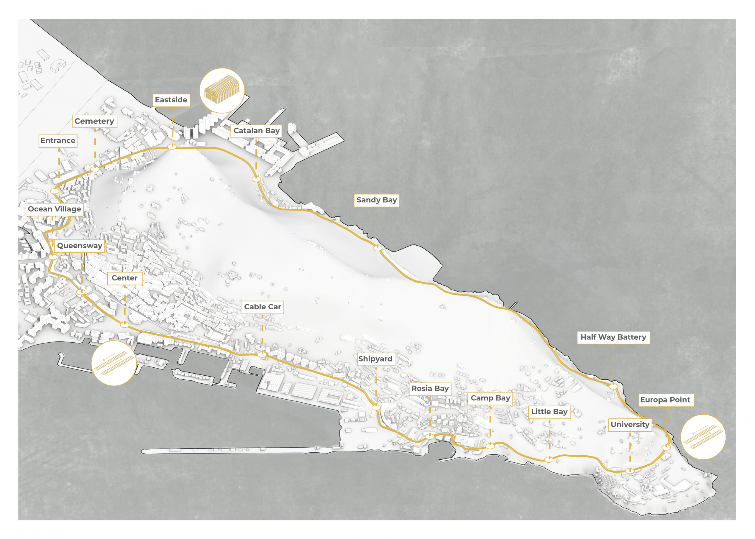 The central design concept is a continuous ring railway that encircles the entire peninsula. This new public transport system serves as a unifying infrastructure element, improving accessibility while reducing dependence on private vehicles. At present, Gibraltar lacks a comprehensive ring connection within its public transport network.