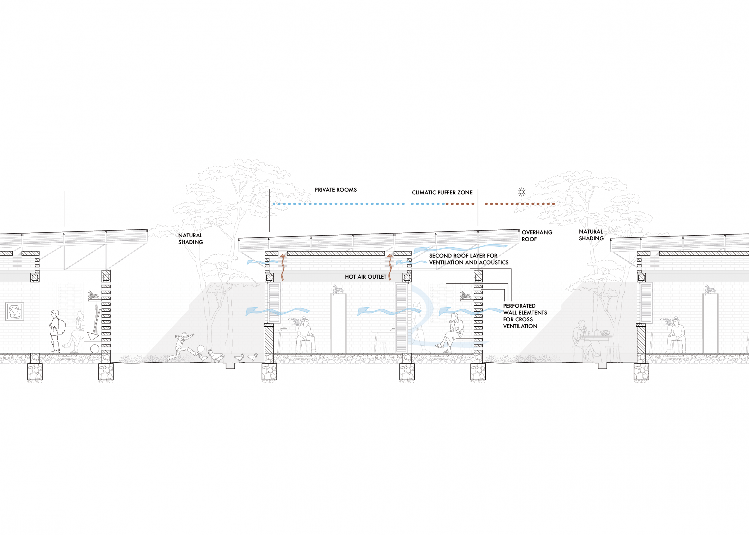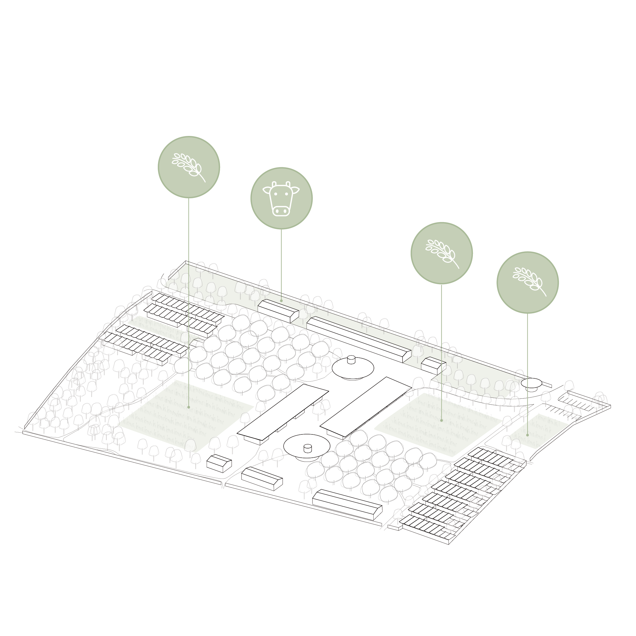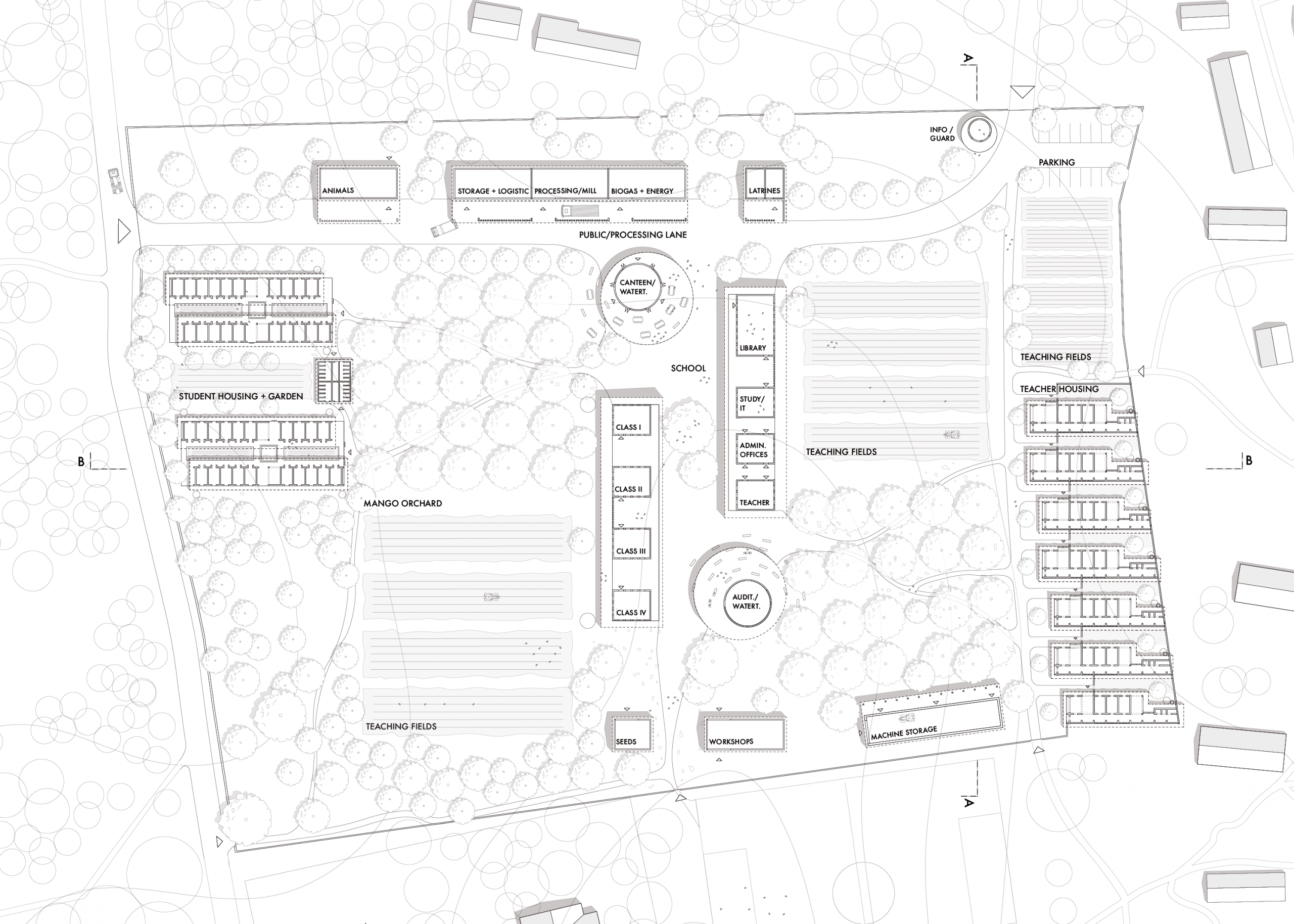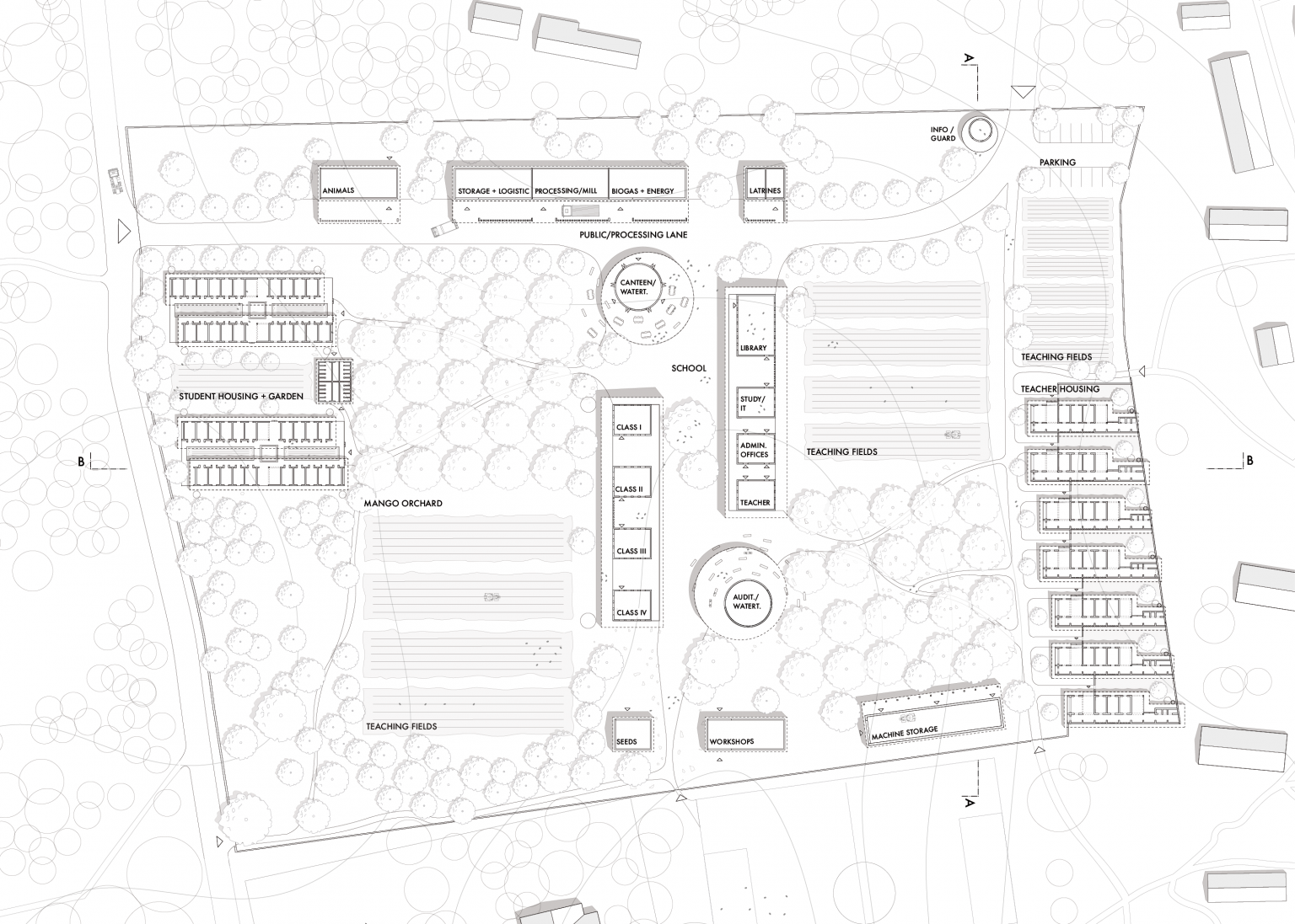 the teachers‘ accommodation, the students‘ accommodation, the school and the production towns. In between are natural elements such as mango plantations and teaching fields.
