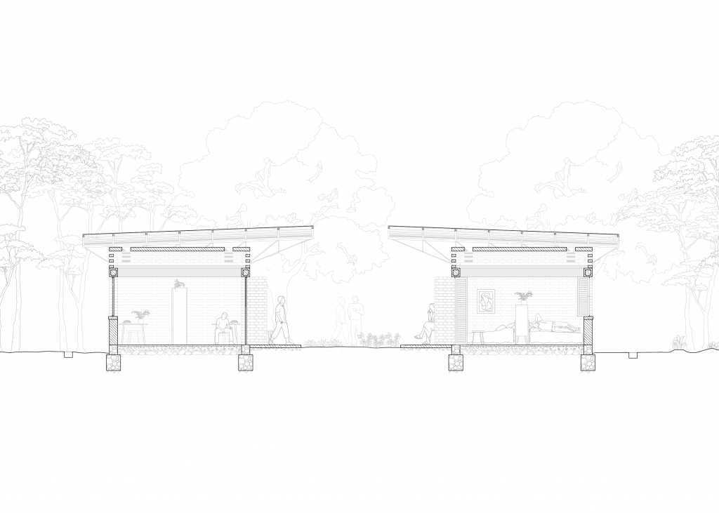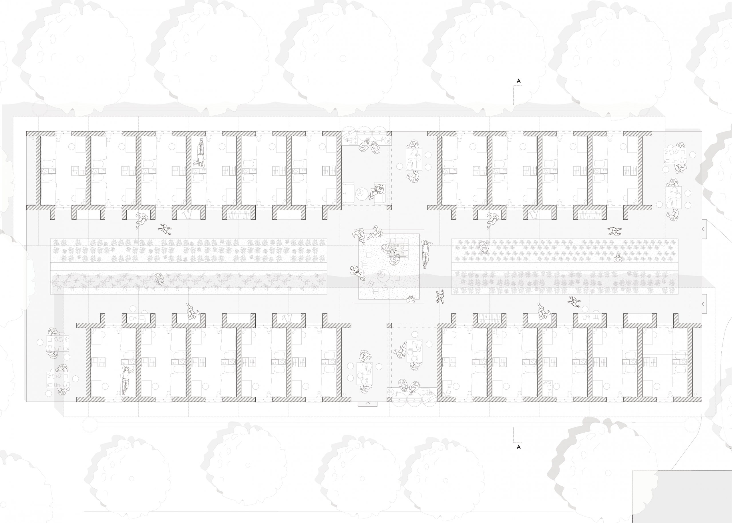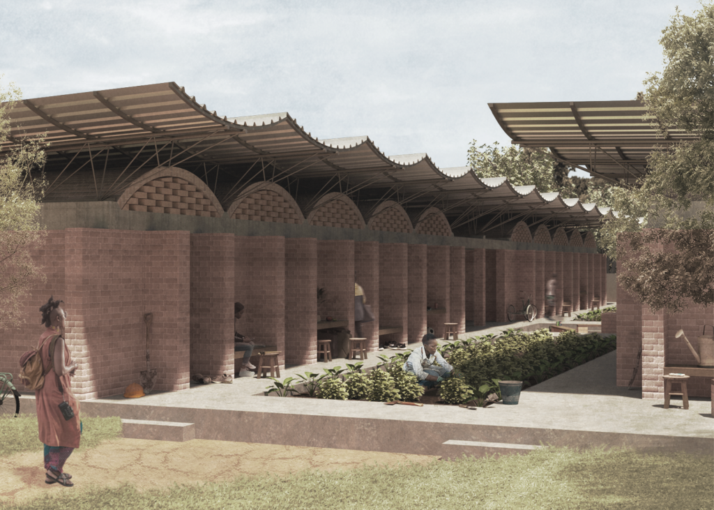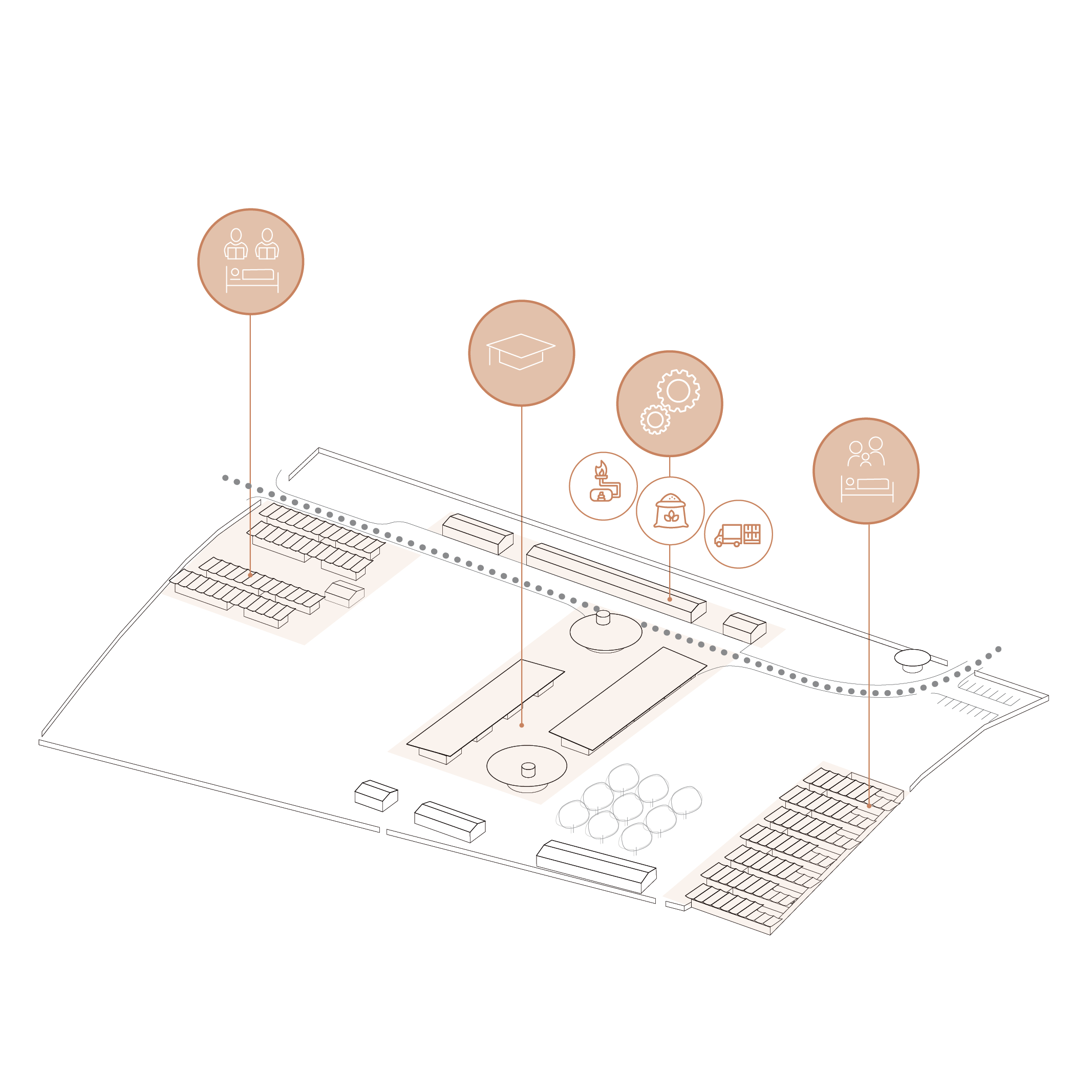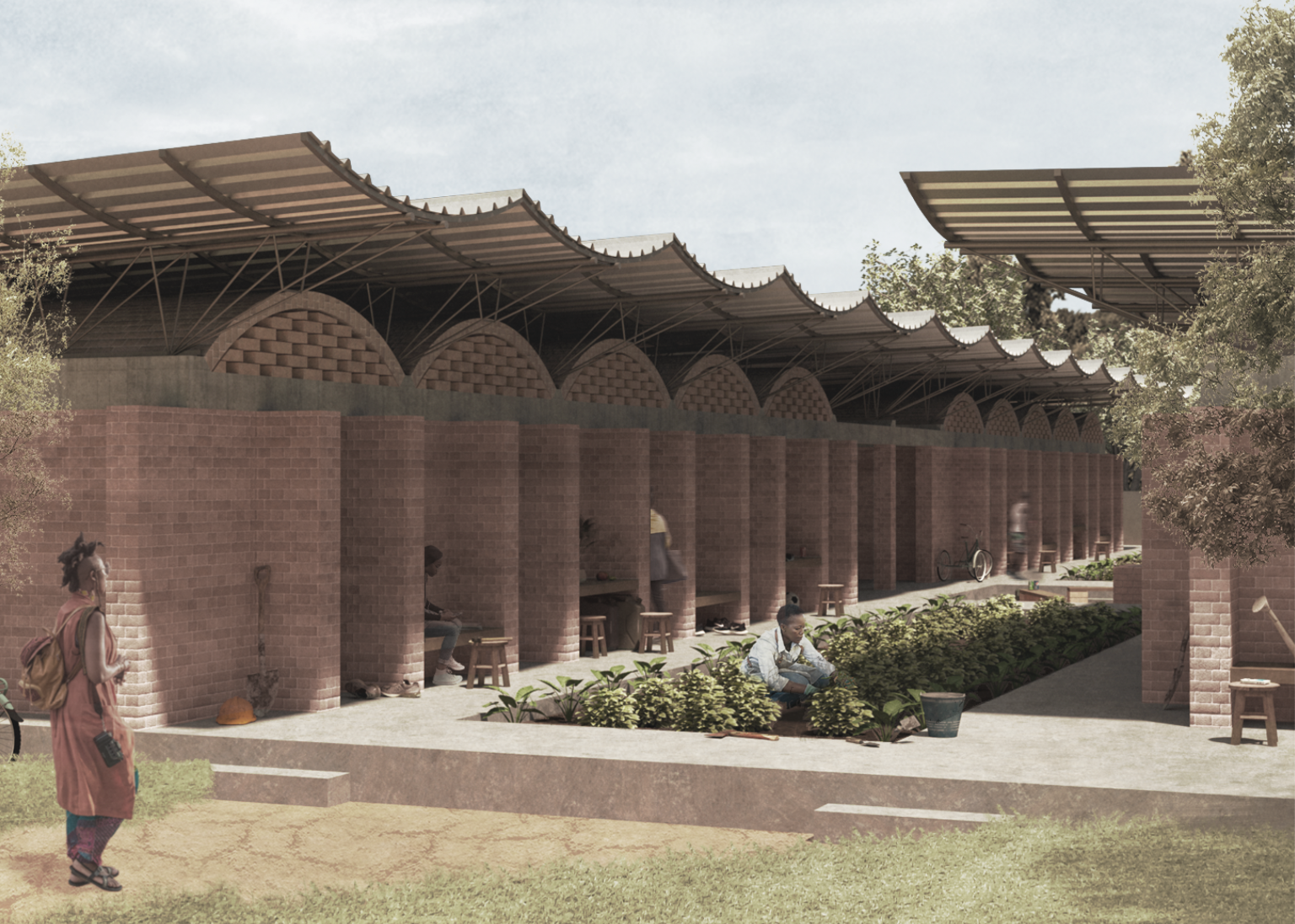 the teachers‘ accommodation, the students‘ accommodation, the school and the production towns. In between are natural elements such as mango plantations and teaching fields.