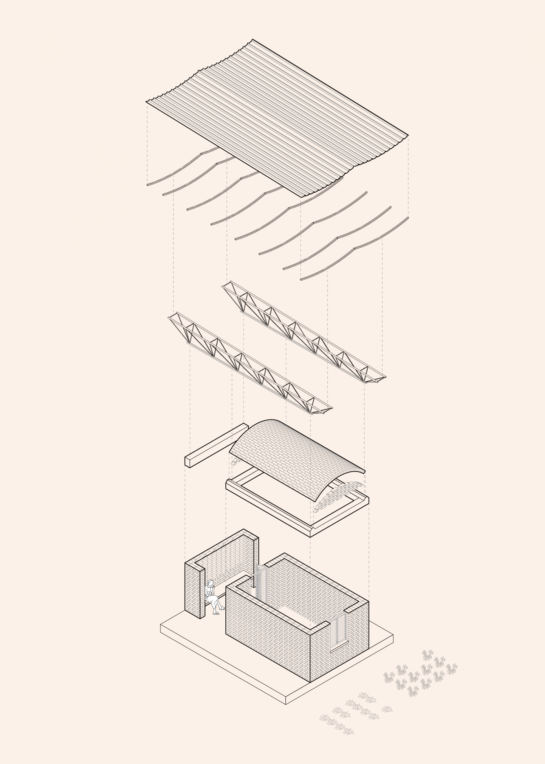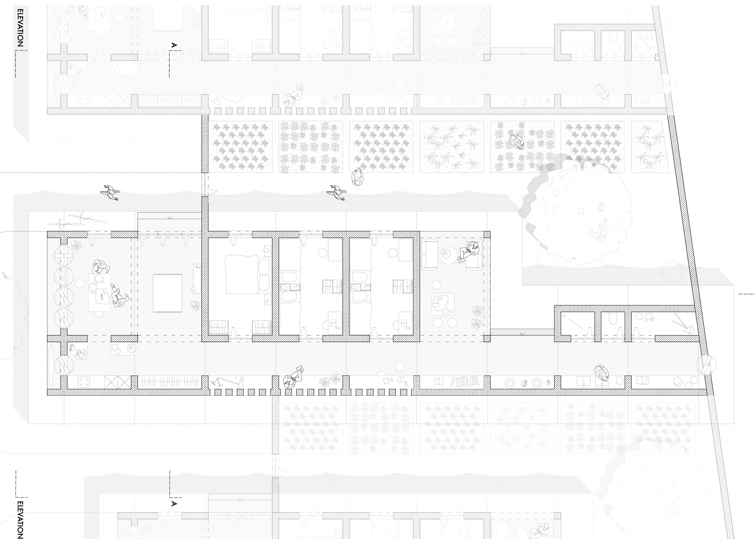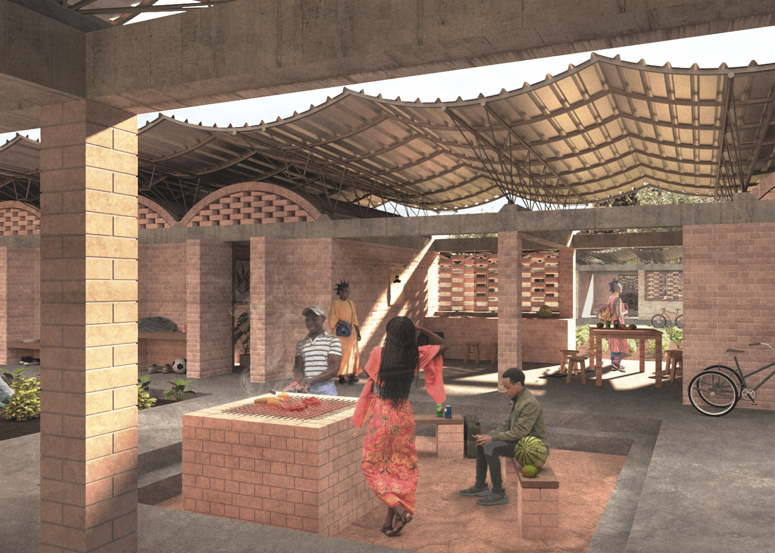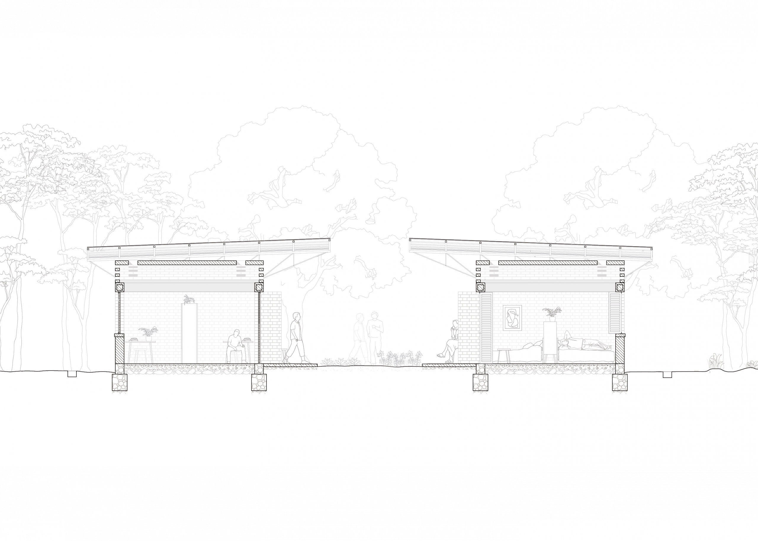 the teachers‘ accommodation, the students‘ accommodation, the school and the production towns. In between are natural elements such as mango plantations and teaching fields.
