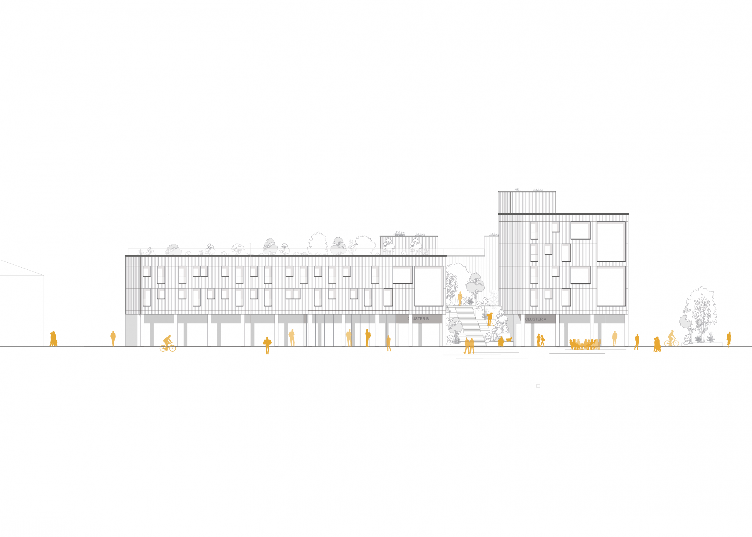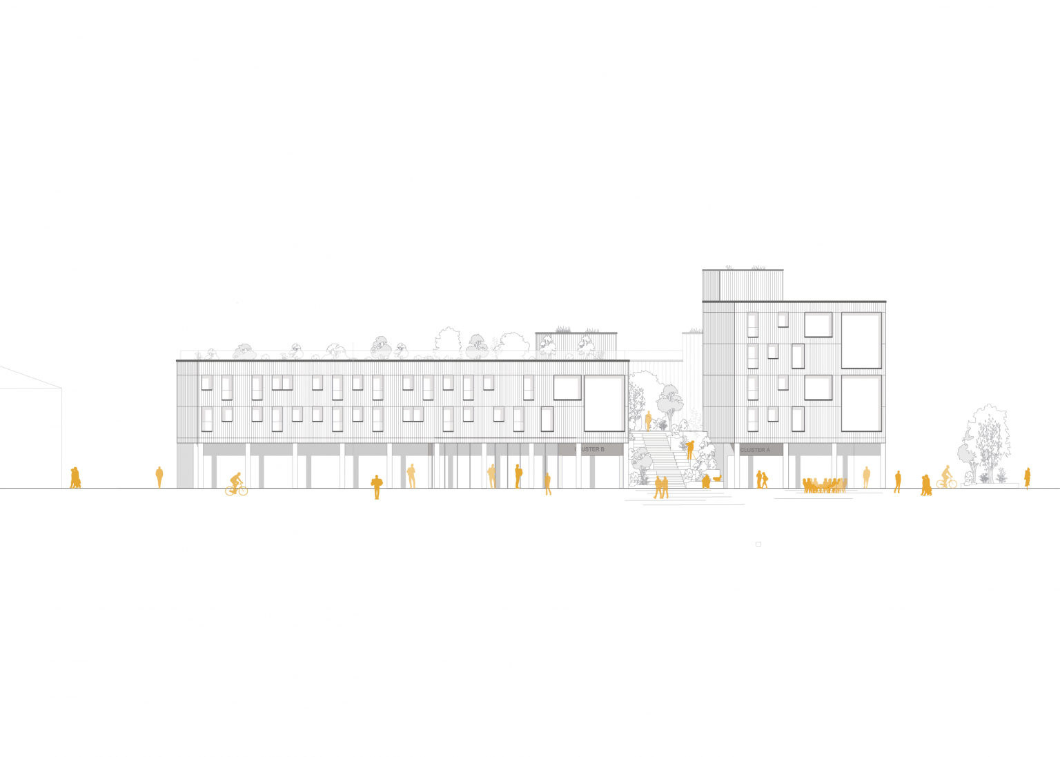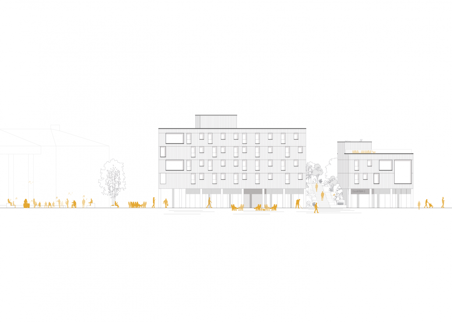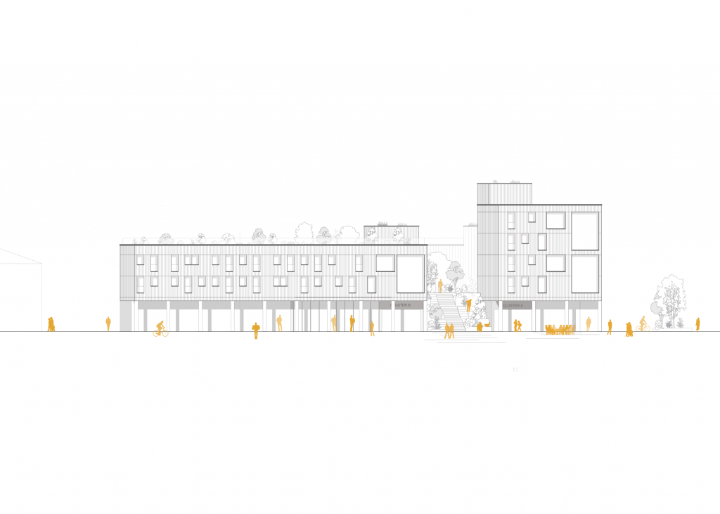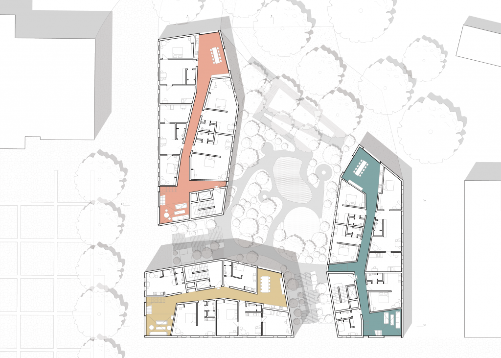 The aim of the design was to challenge the existing typology through a multi-generational cluster that promotes community interaction and the shared use of resources. On the ground floor, a café, bar, fitness studio, and local shops open up towards the street and the square, activating the public realm. A semi-private courtyard and sheltered green spaces provide a high quality of stay and areas for social interaction. Circulation is organized around a central core, and all areas are designed to be fully barrier-free.
