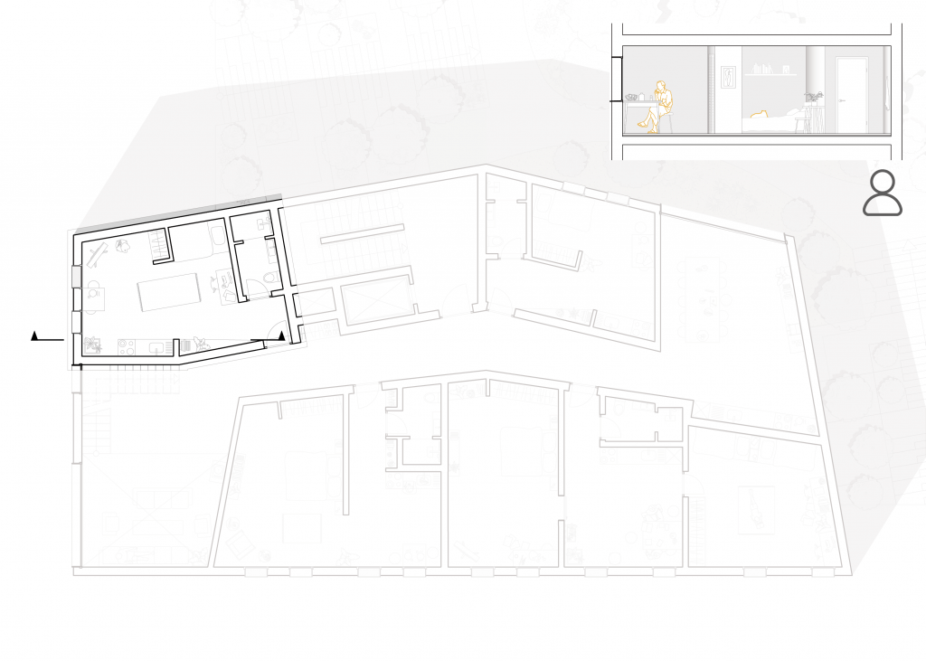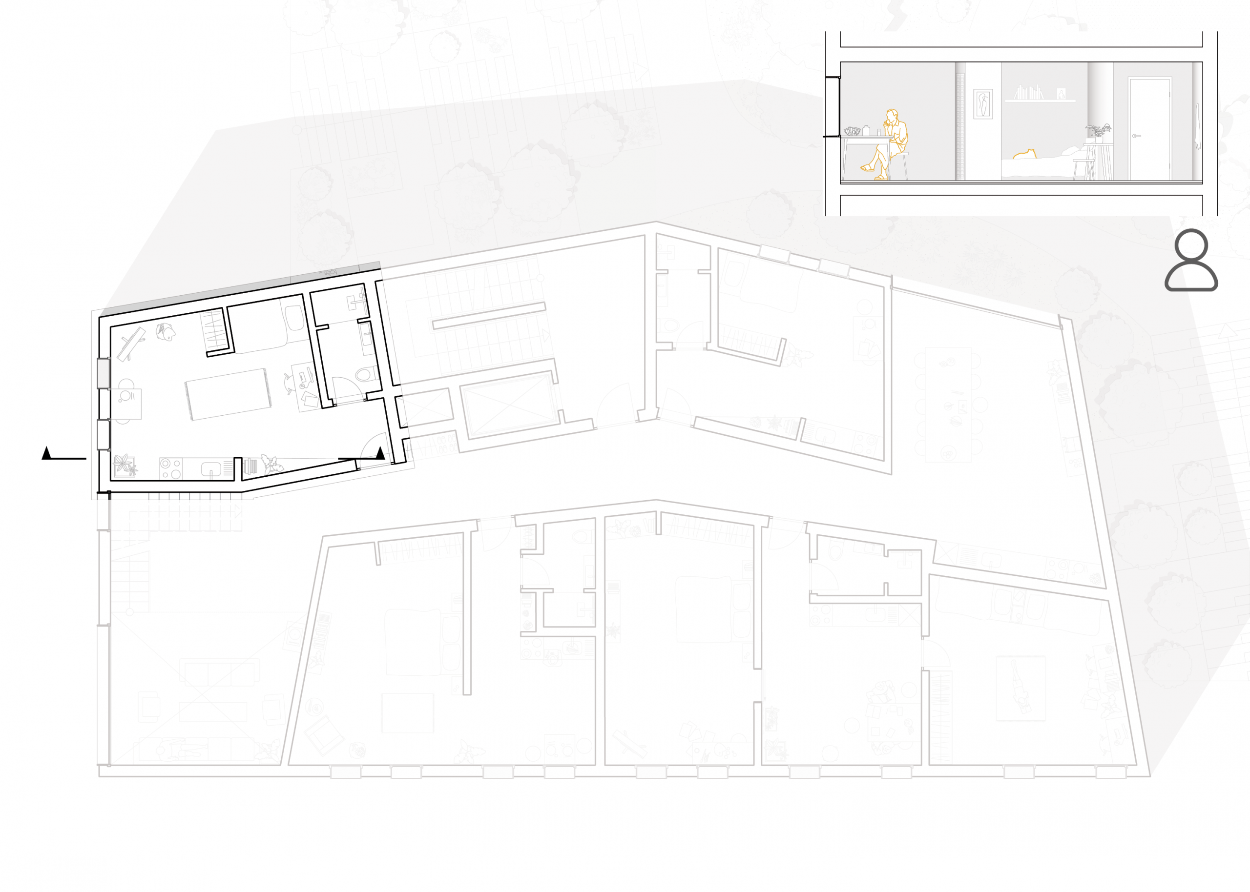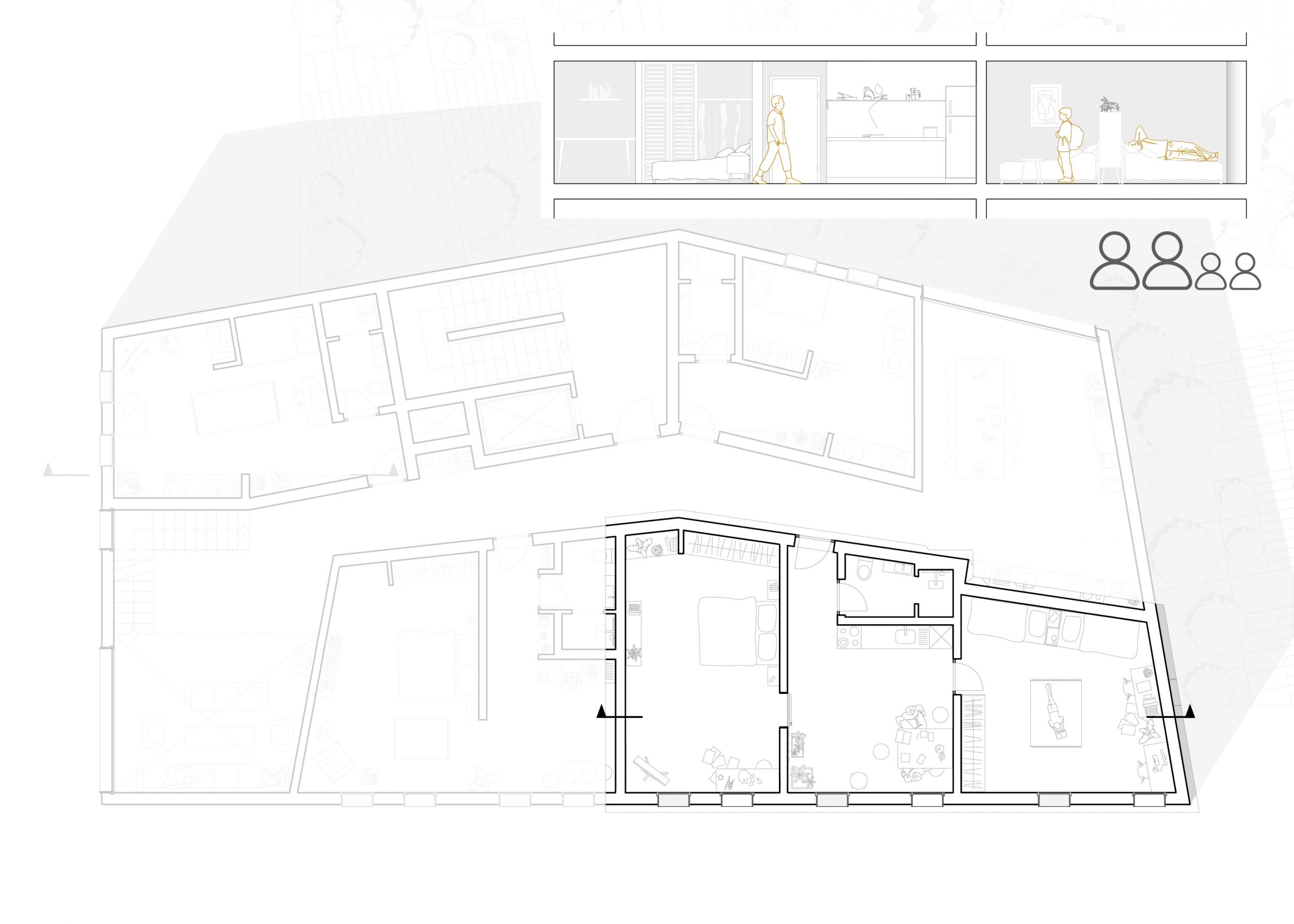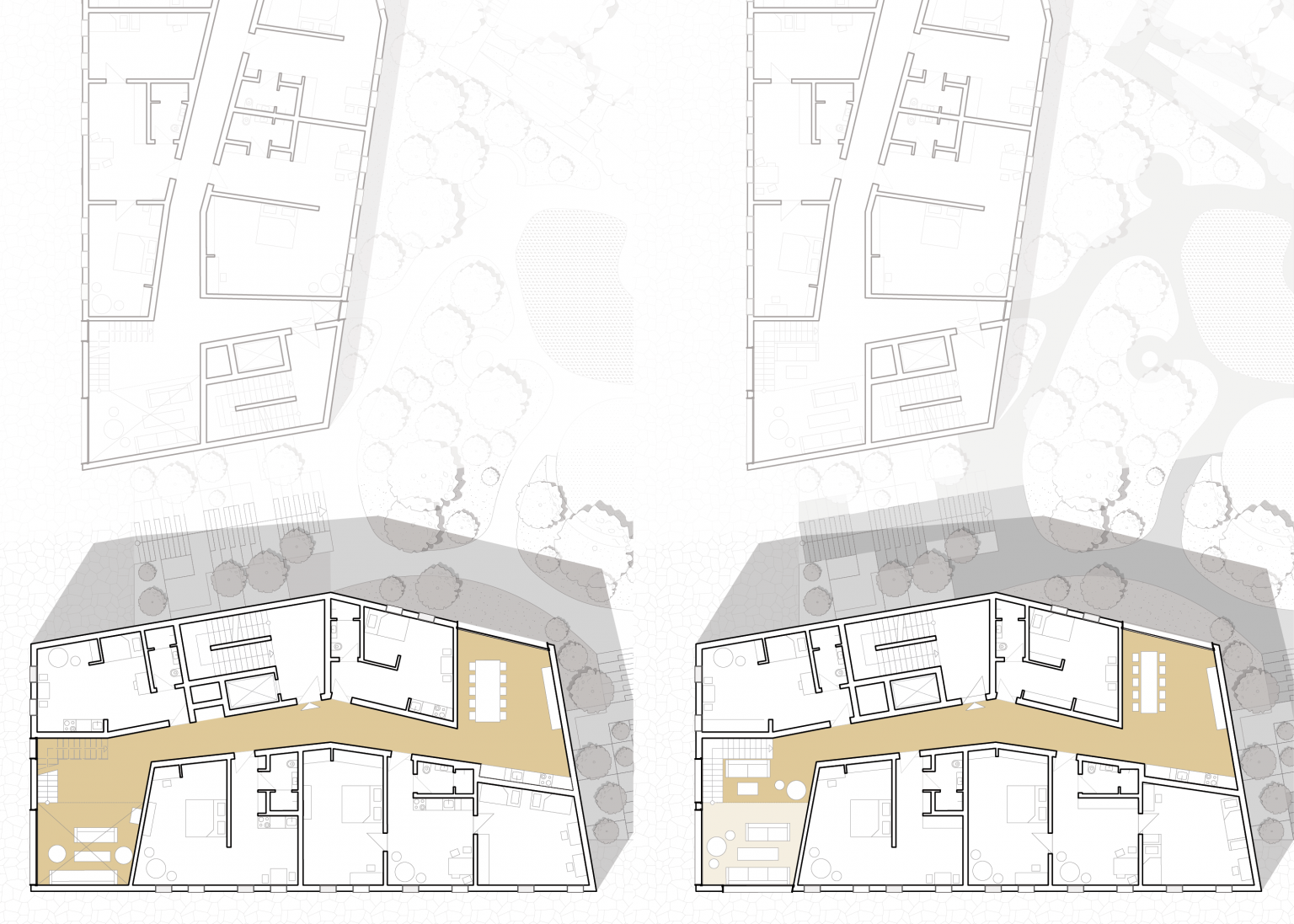 The aim of the design was to challenge the existing typology through a multi-generational cluster that promotes community interaction and the shared use of resources. On the ground floor, a café, bar, fitness studio, and local shops open up towards the street and the square, activating the public realm. A semi-private courtyard and sheltered green spaces provide a high quality of stay and areas for social interaction. Circulation is organized around a central core, and all areas are designed to be fully barrier-free.