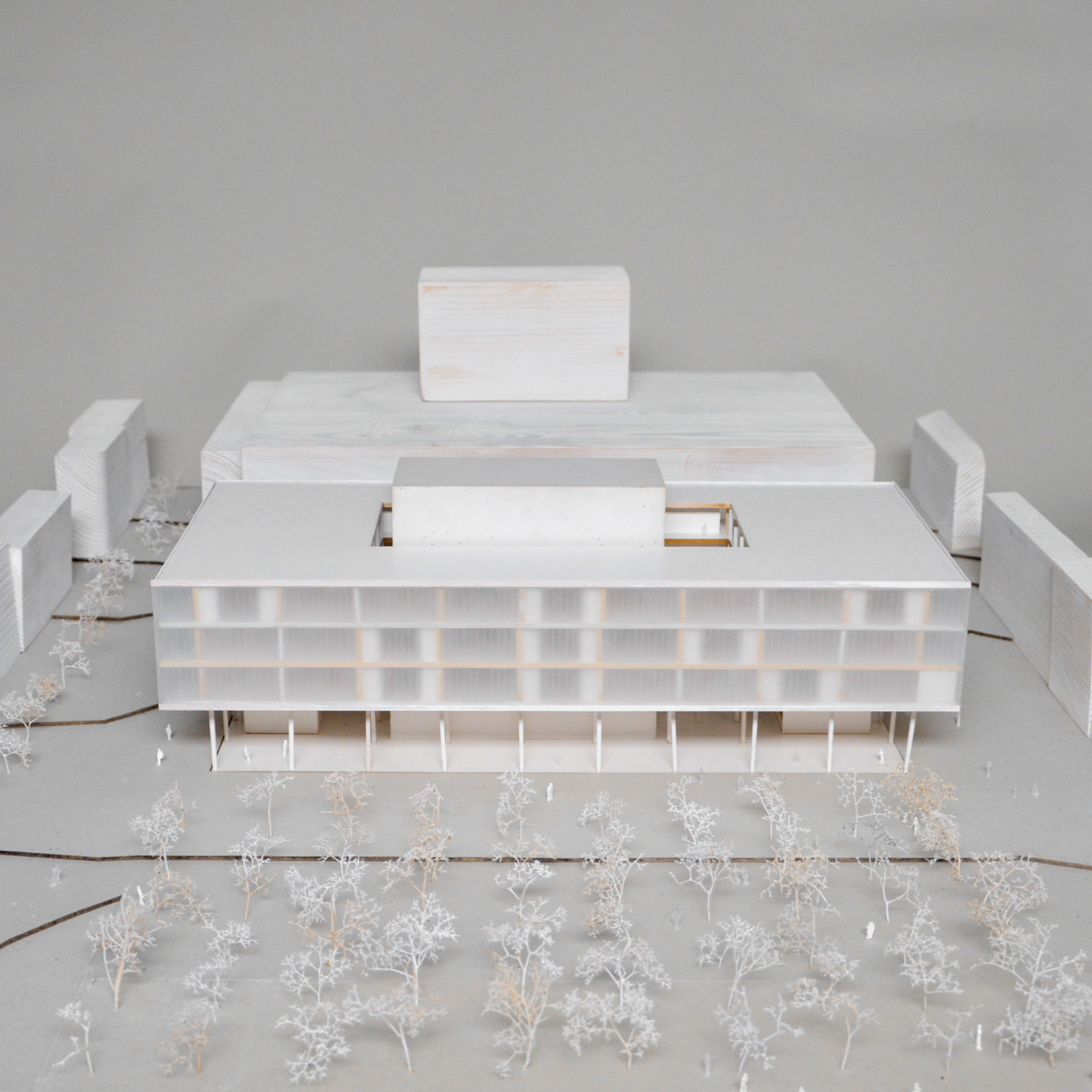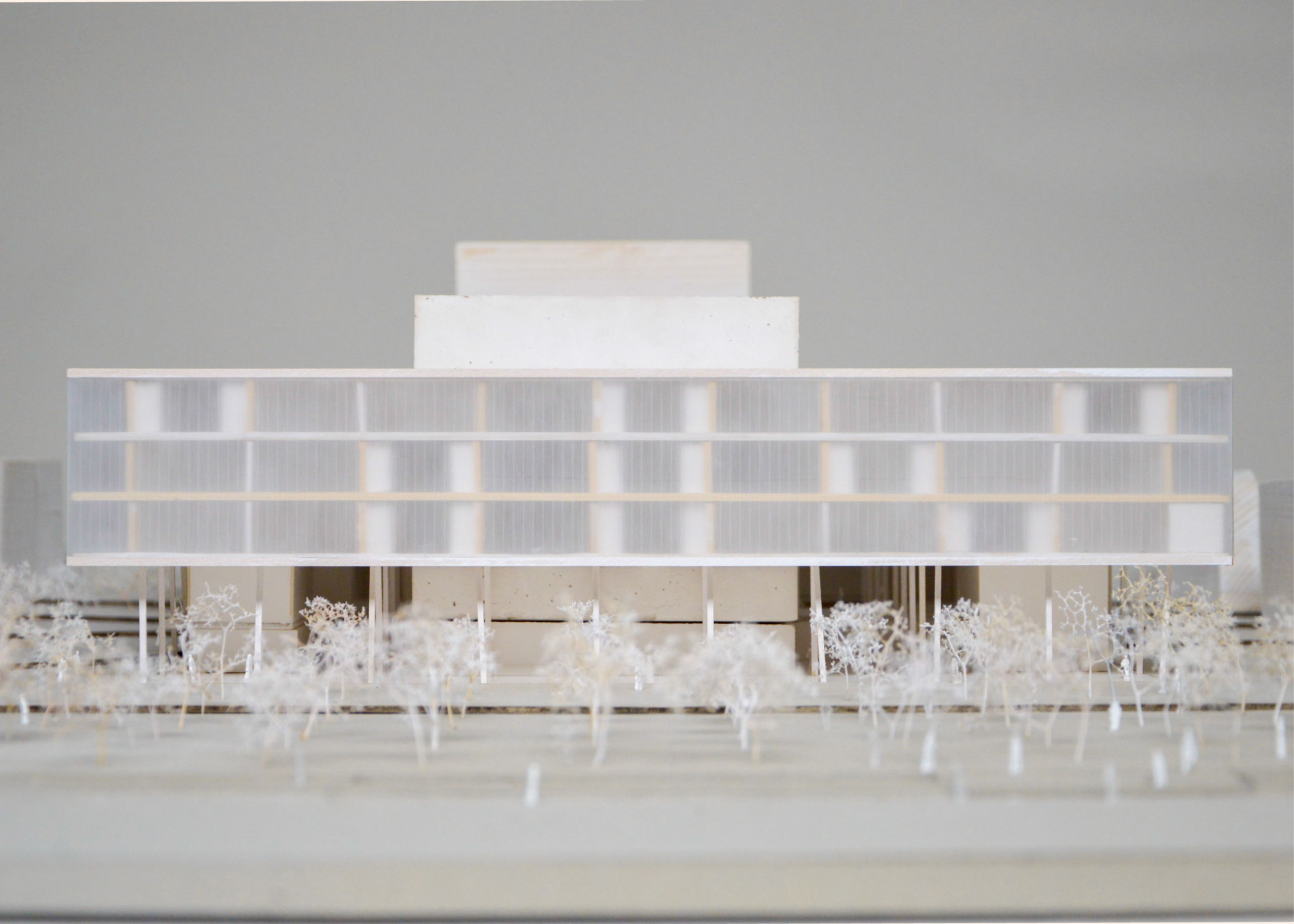 The rehearsal center features a transparent post-and-beam facade on the lower levels, giving the building an almost floating appearance. The upper floors are clad in translucent U-glass elements, forming a softly glowing and distinctive envelope that enhances the building’s presence within the urban context.