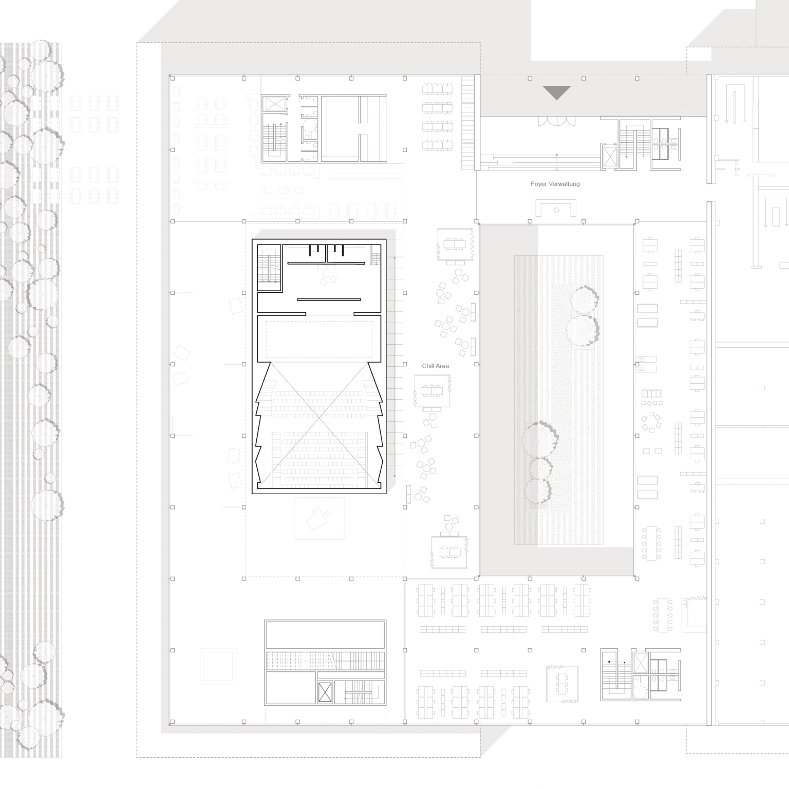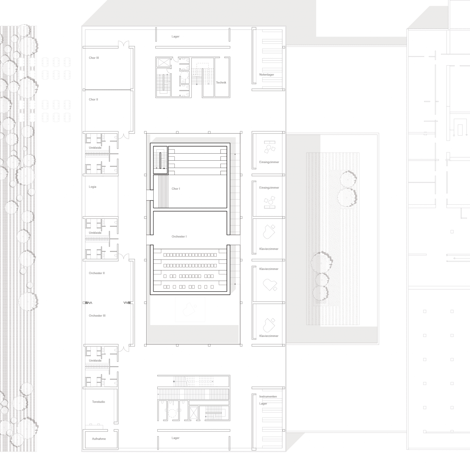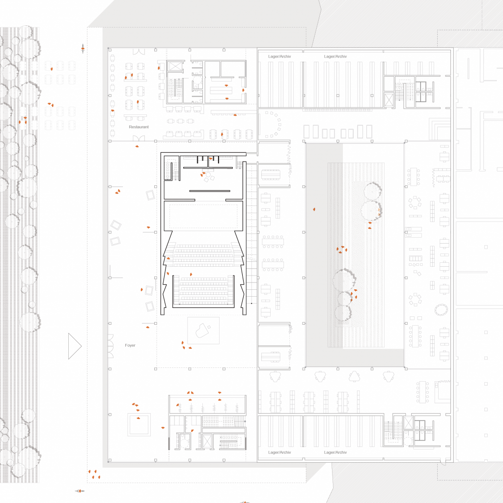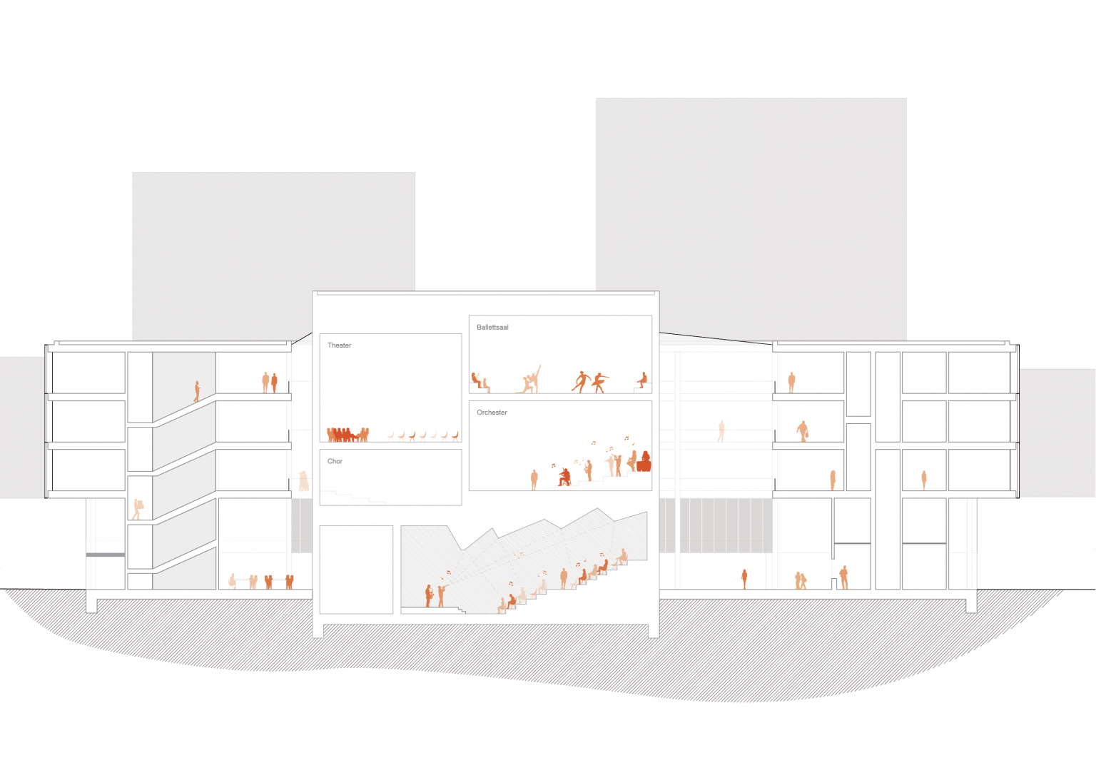The design integrates the theater’s distinctive massing and its recessed podium. Two courtyards are carved into the volume to provide natural daylight, while the monolithic building form is contrasted and activated by the rehearsal spaces, creating spatial tension. Circulation cores, including staircases and service units, are functionally oriented toward the rear light void.