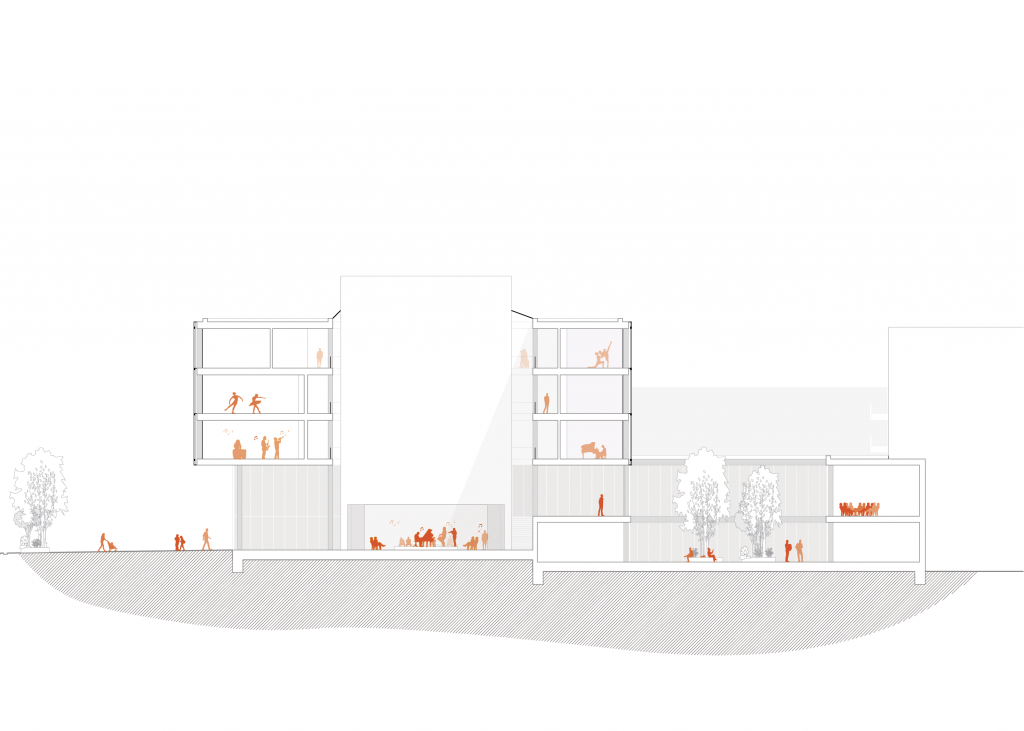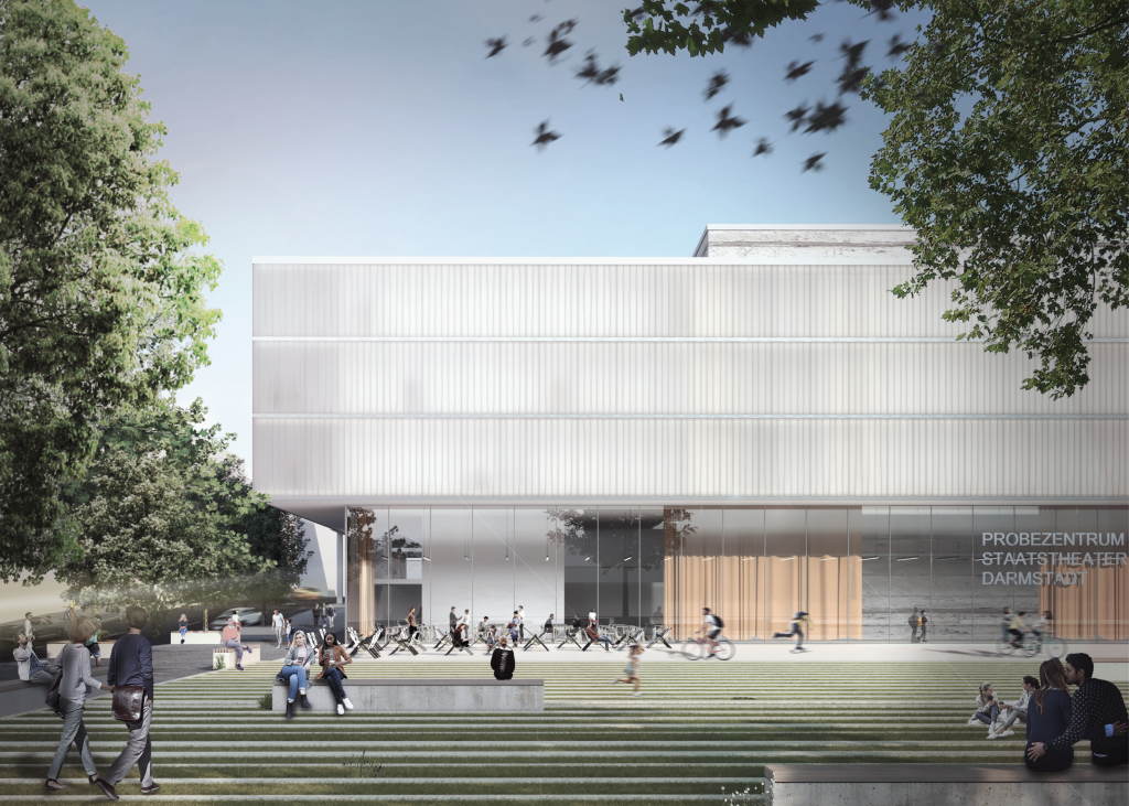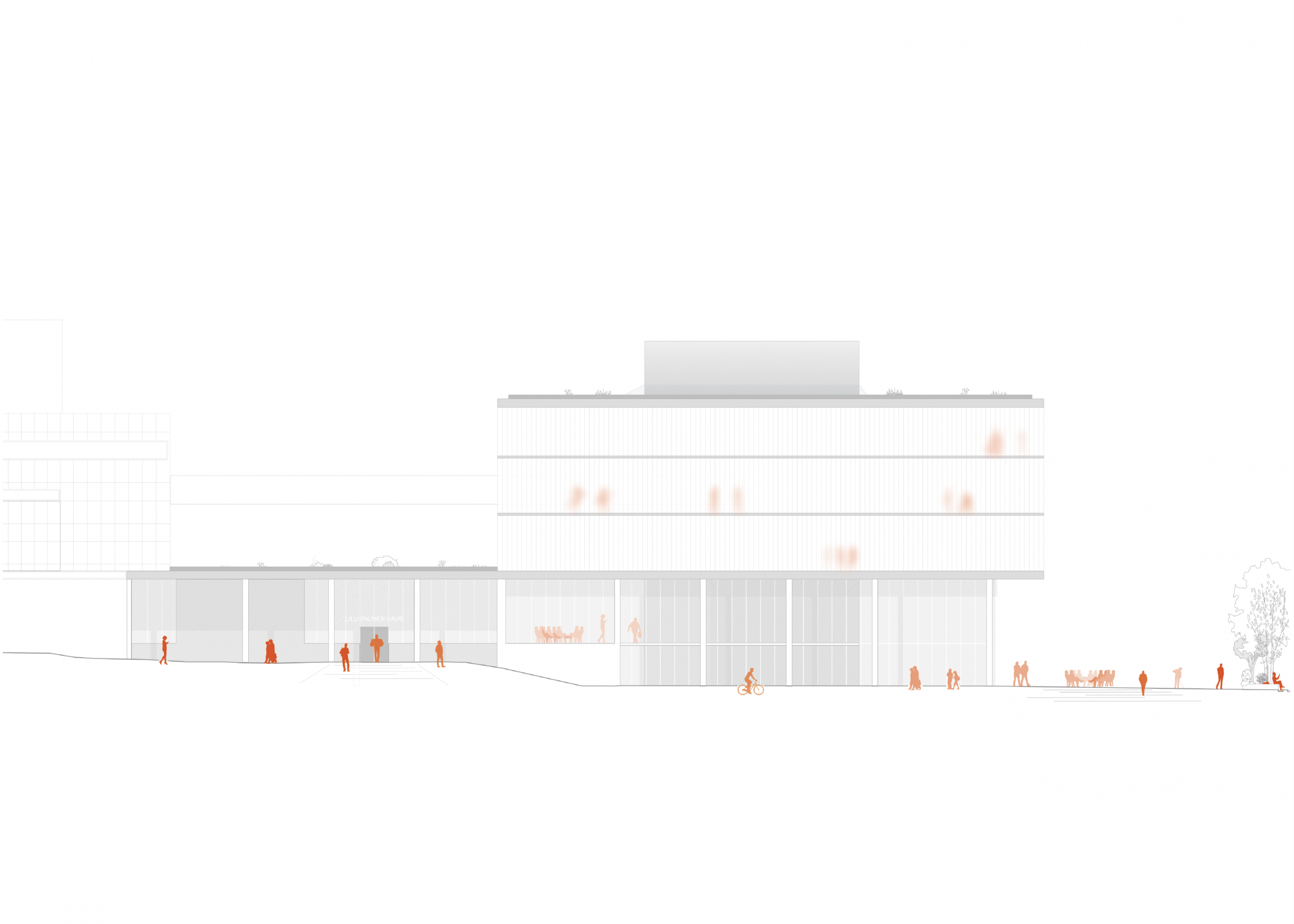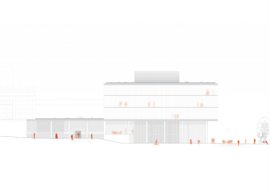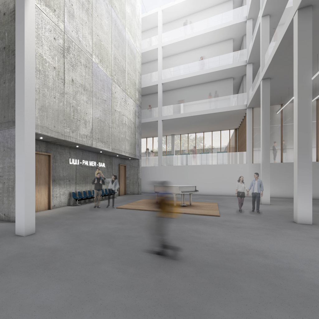 The design integrates the theater’s distinctive massing and its recessed podium. Two courtyards are carved into the volume to provide natural daylight, while the monolithic building form is contrasted and activated by the rehearsal spaces, creating spatial tension. Circulation cores, including staircases and service units, are functionally oriented toward the rear light void.