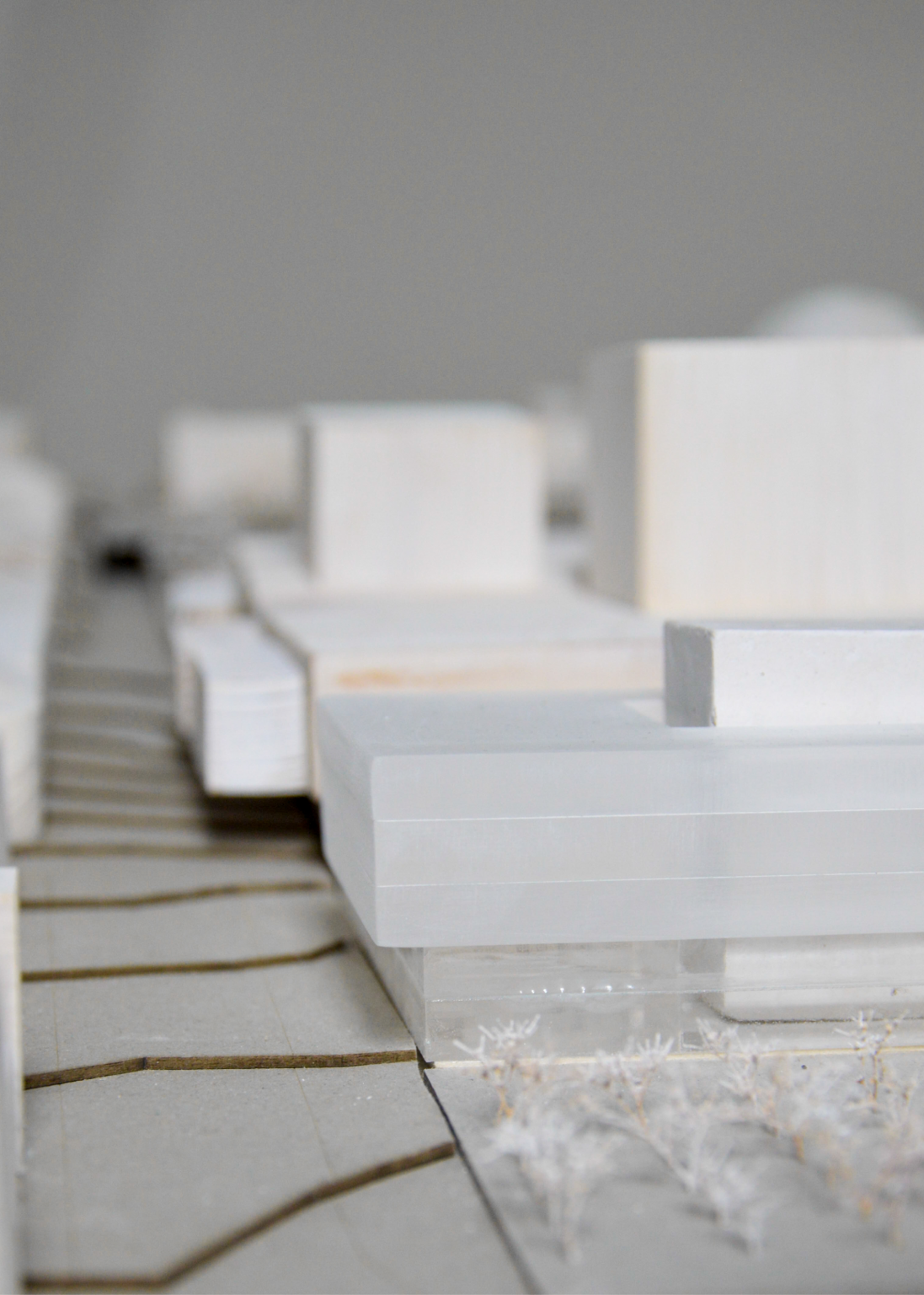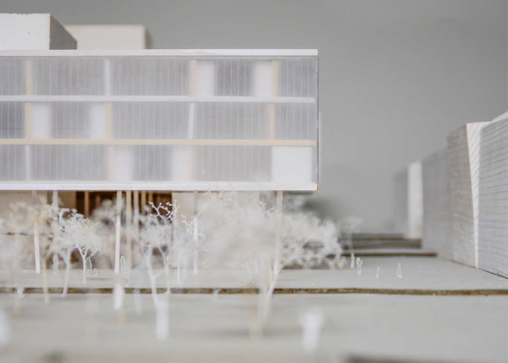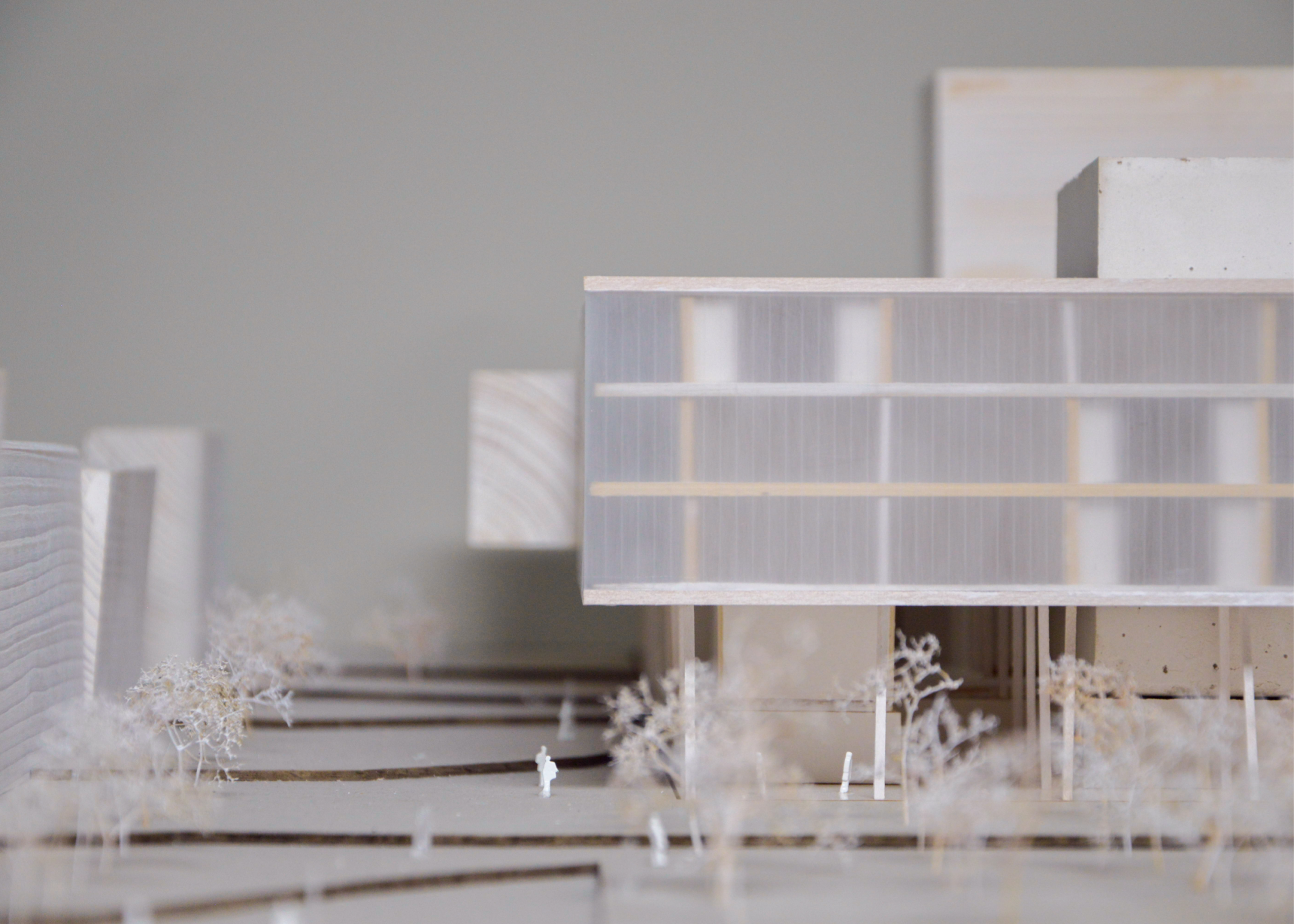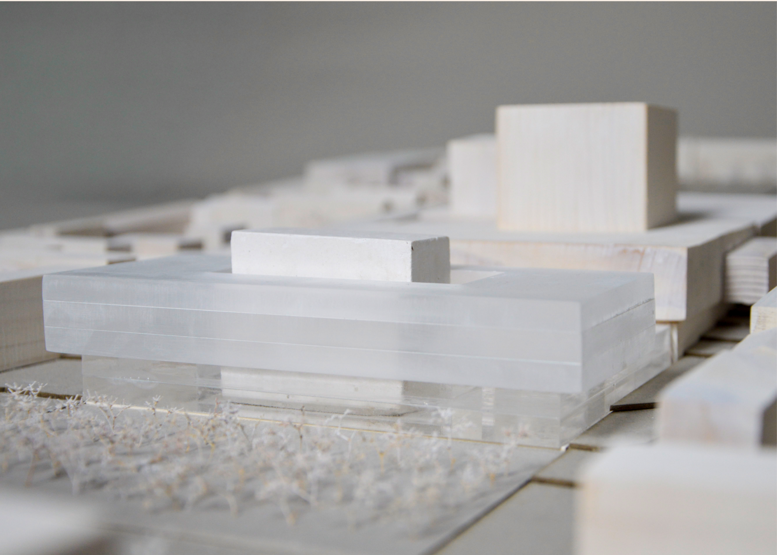 The design integrates the theater’s distinctive massing and its recessed podium. Two courtyards are carved into the volume to provide natural daylight, while the monolithic building form is contrasted and activated by the rehearsal spaces, creating spatial tension. Circulation cores, including staircases and service units, are functionally oriented toward the rear light void.